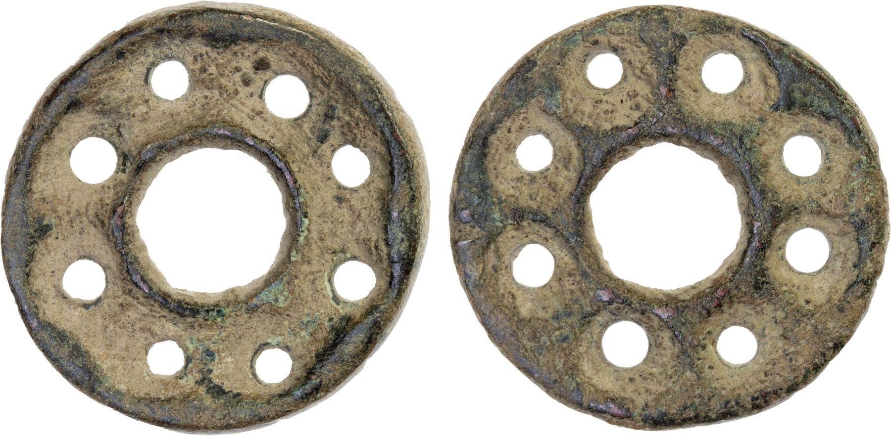 SEMIRECH'E: Anepigraphic, ca. 760-900+, AE cash (3.09g), cf. Zeno-47785, local imitation, area marked by 8 holes, Chinese-style "cash" with round central hole, bold VF, RR.