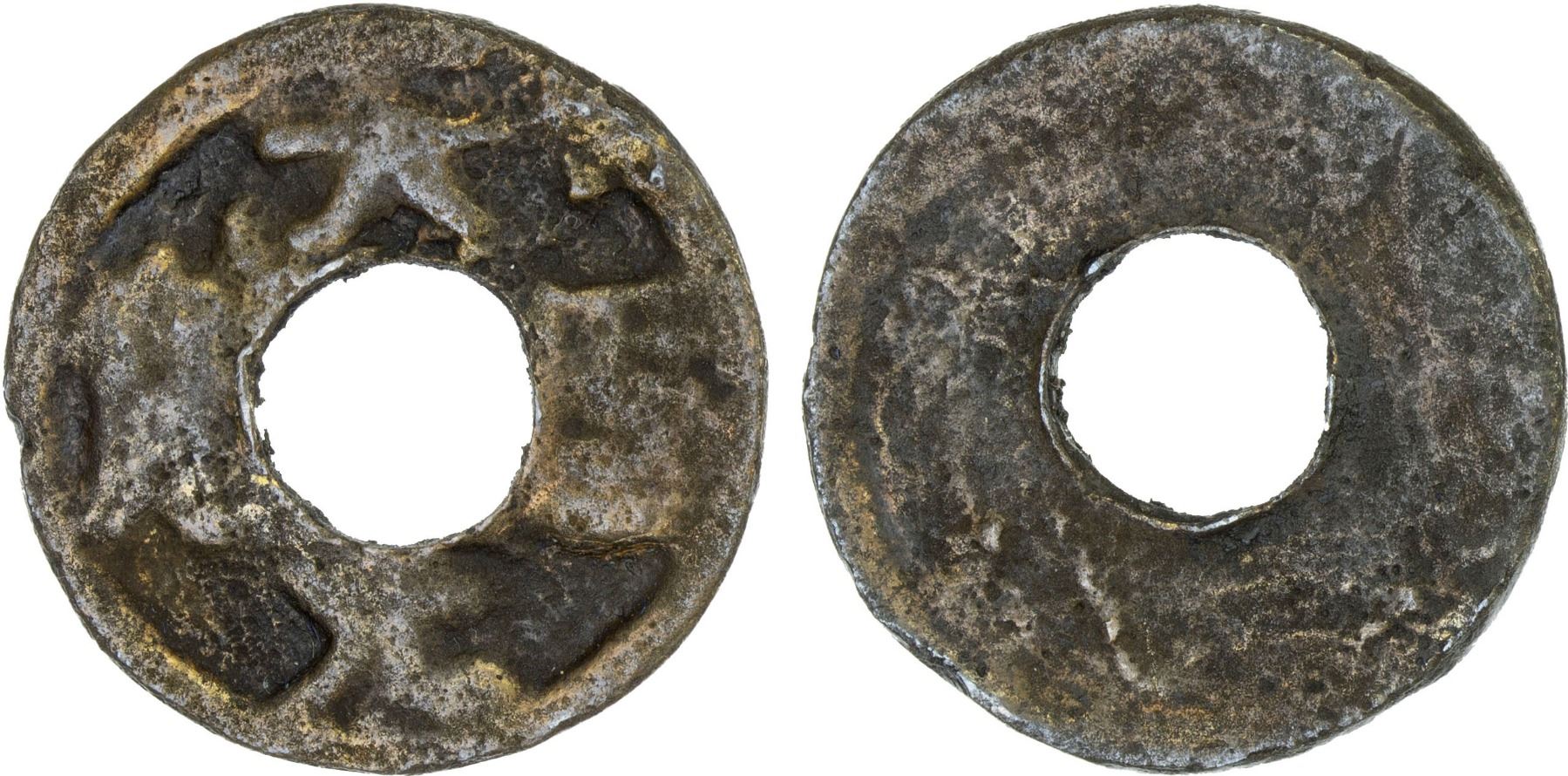 SEMIRECH'E: "Da Li Yuan Bao", ca. 800±, AE cash (3.30g), Kam-11, cf. Zeno-343717, copying the Chinese cash of the Tang rebellion Da Li period (766-779); always crudely cast, as can be seen on the group illustrated on Zeno (none on Coin-Archives); porous surfaces, crude Fine, RRR.