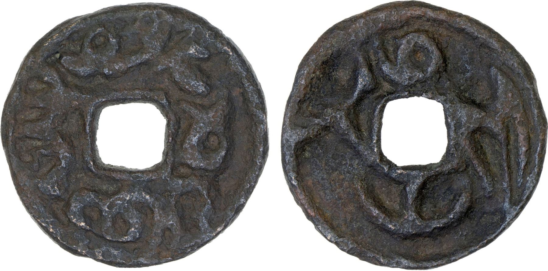 SEMIRECH'E: Inal-tegin, mid-8th century, AE cash (2.86g), Kam-34, cf. Zeno-216064, name of ruler in distorted Sogdian script // Runic letter M and M and Sogdian word prn ("glory"), VF.