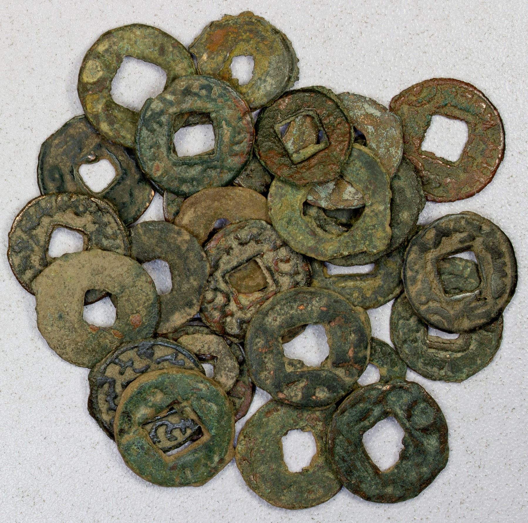 SEMIRECH'E: LOT of 28 copper cash, mostly from Turgesh, including a couple of Arslanid types of Bilge Qaghan and Tukhus of Oghitmish; also several blank examples and several unclear; all with square central holes; nearly all of the range of 1.0g to 1.6g, plus a few much smaller; unidentified, average VG to Fine condition, but many lower, viewing recommended; retail value $500, lot of 28 pieces.