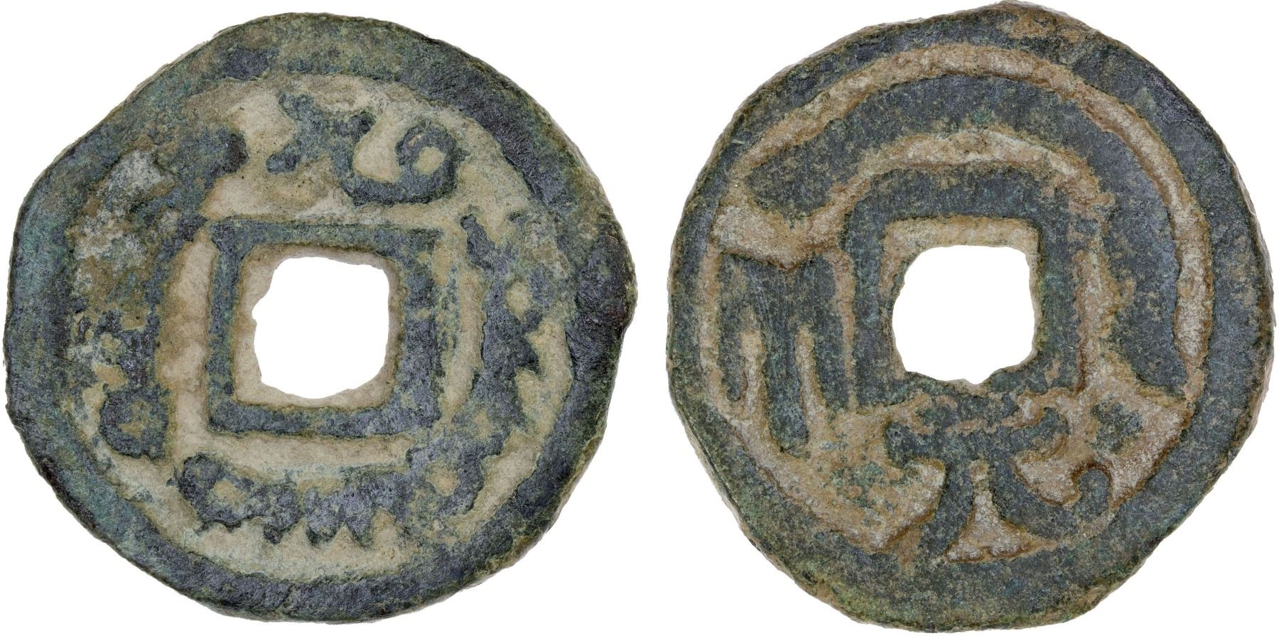SEMIRECH'E: Wahshutawa, 8th century, AE cash (3.76g), Kamyshev-21, xst'w w'xswt'wy pny ("coin of King Wahshutawa") // semi-circular Turgesh tamgha with one Runic letter R and Chinese yuan, pleasing VF, R. There are two distinct types of Wahshutawa (Vahshugava): Kam-21 with Chinese "yuan" on the reverse (average weight 3.5g, about 23mm) and Kam-36 with Sogdian "prn" (glory) instead of the Chinese "yuan" (average weight 1.8g, about 16mm). The relationship between the two types is unknown. At present there are about 20 pieces of the "yuan" type in online auction archives, none of the "prn" type!