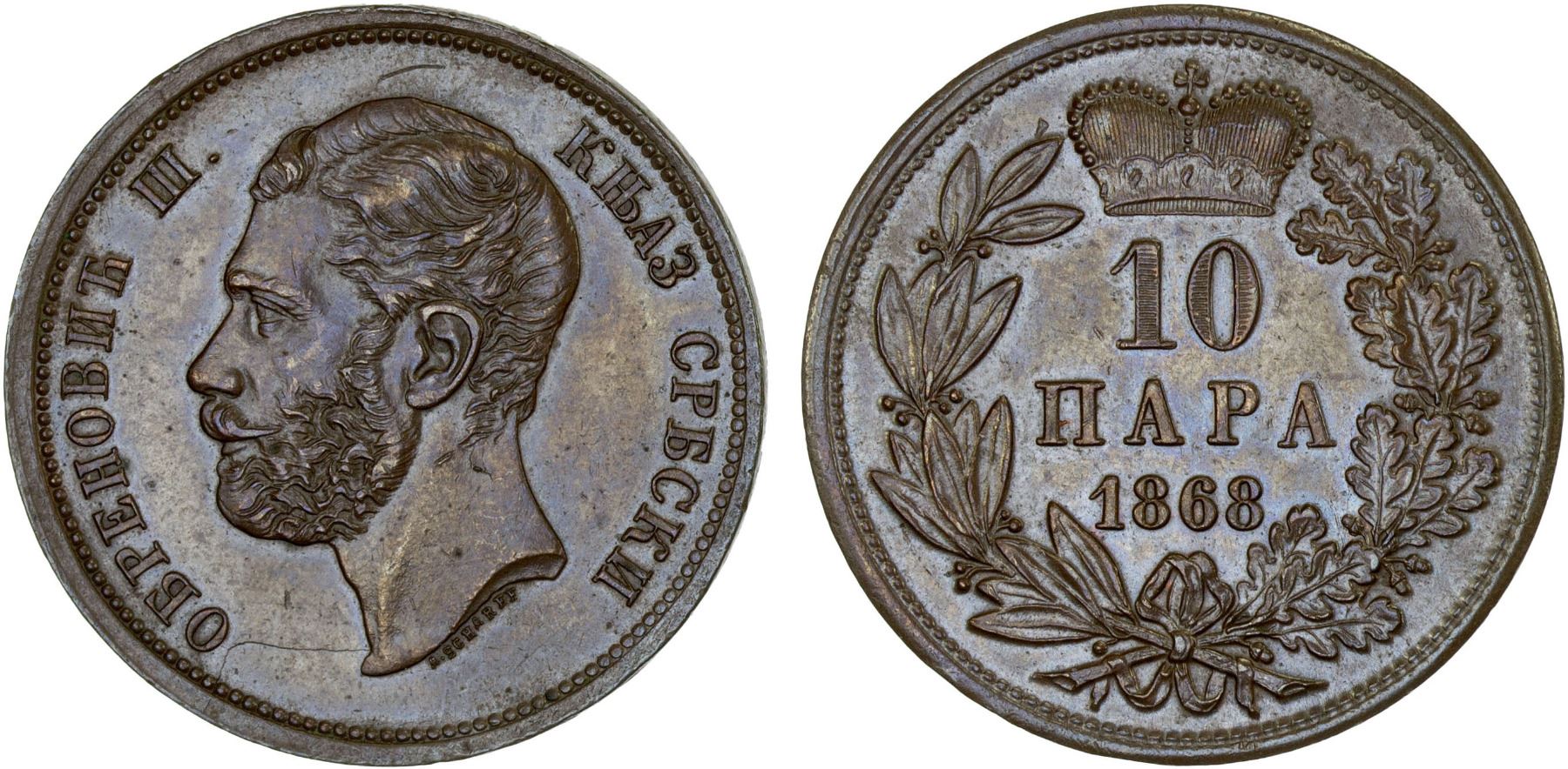 SERBIA: Michael, Obrenovich III, 1860-1868, AE 10 para, 1868, AU