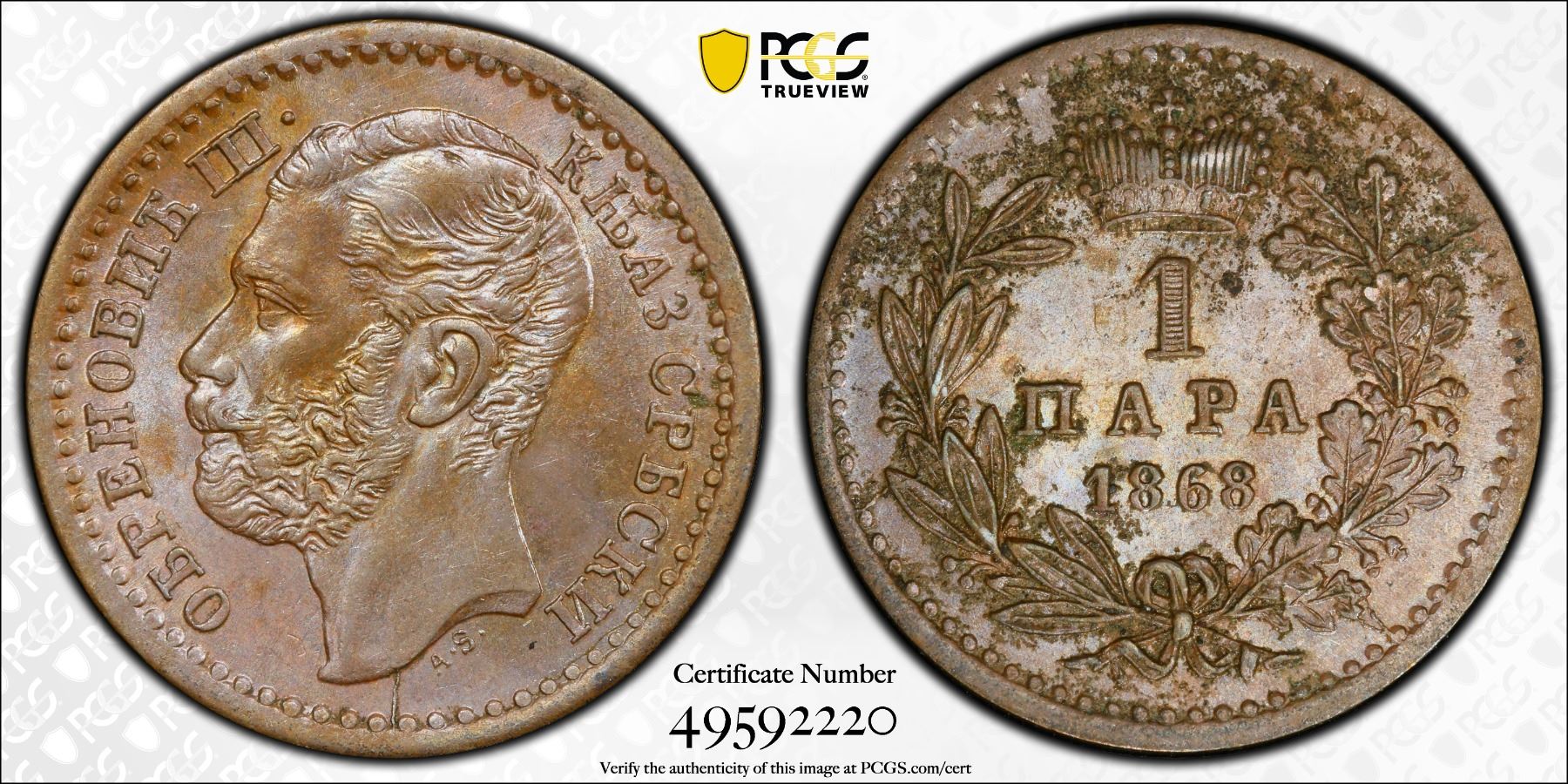 SERBIA: Mihailo Obrenovic III, 2nd reign, 1860-1868, AE para, 1868, KM-1.1, struck at the Paris Mint, a lovely mint state example! PCGS graded MS63 BN.