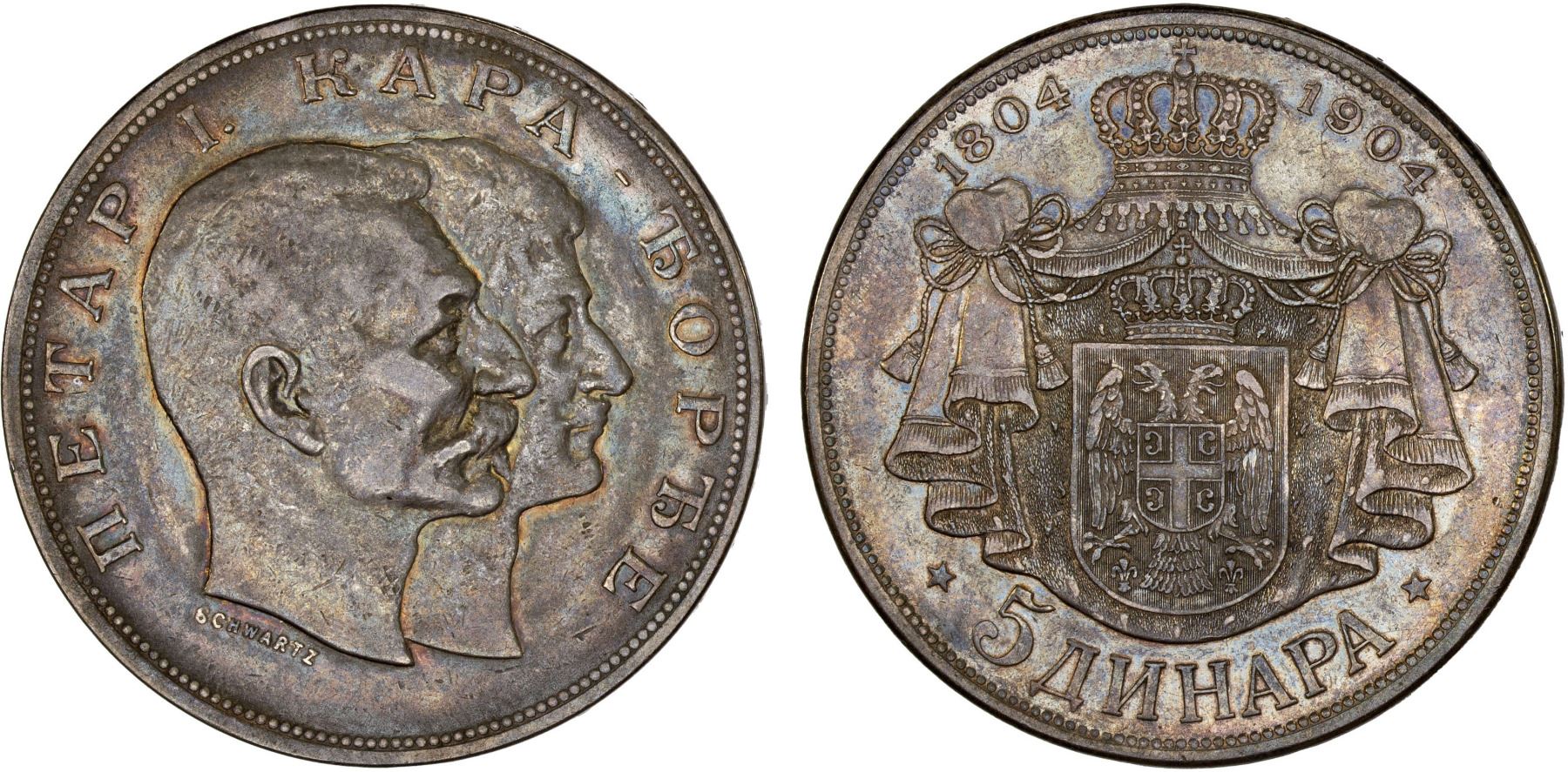 SERBIA: Peter I, 1903-1918, AR 5 dinara, 1904, KM-27, 100th Anniversary of the Karageorgevich Dynasty, nice light iridescent toning, Choice VF.