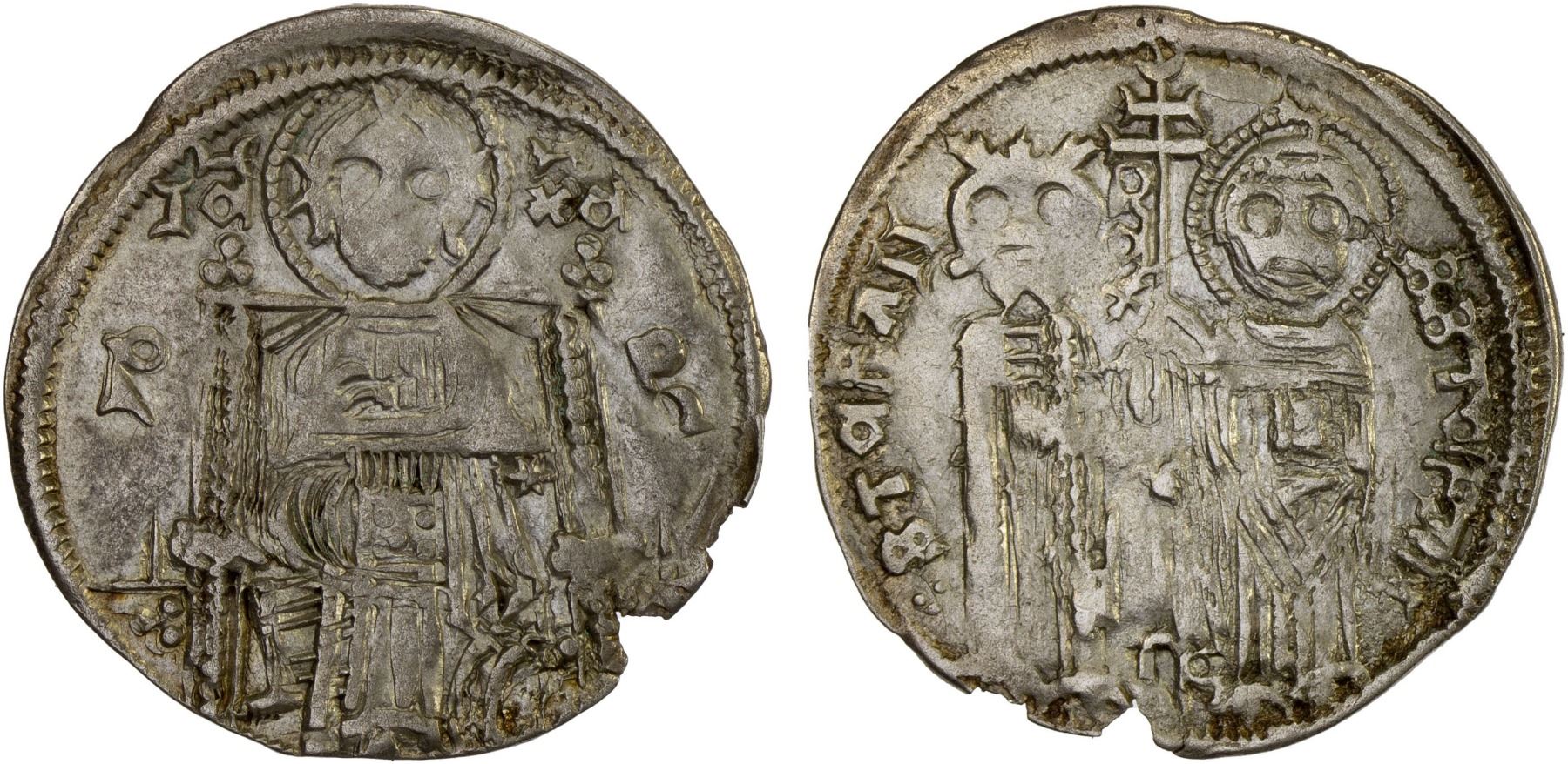 SERBIA: Stefan Uros IV Dusan, 1331-1346, AR denar (1.2g), D&D-6.1.1, Christ Pantokrator seated facing, IC-XC, P-R across field // the king and St. Stephen standing facing, holding patriarchal cross between them, STEFAN / REX / S STEFAN, VF.