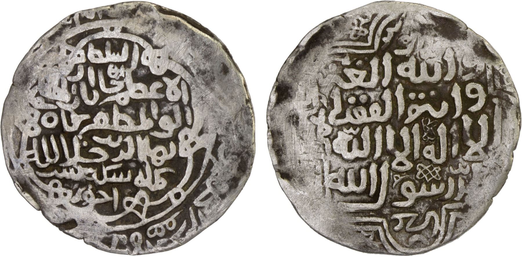 SHAHS OF BADAKHSHAN: Shah Baha al-Din, 1344-1358, AR dinar kebeki (7.25g), Khwast, ND, A-2015, Zeno-45947, with the astonishing religious phrase added above the kalima in the reverse field: Allah al-ghani / wa antum al-fuqrâ, "God is rich and you are poor"; aveage strike, VF, RR.