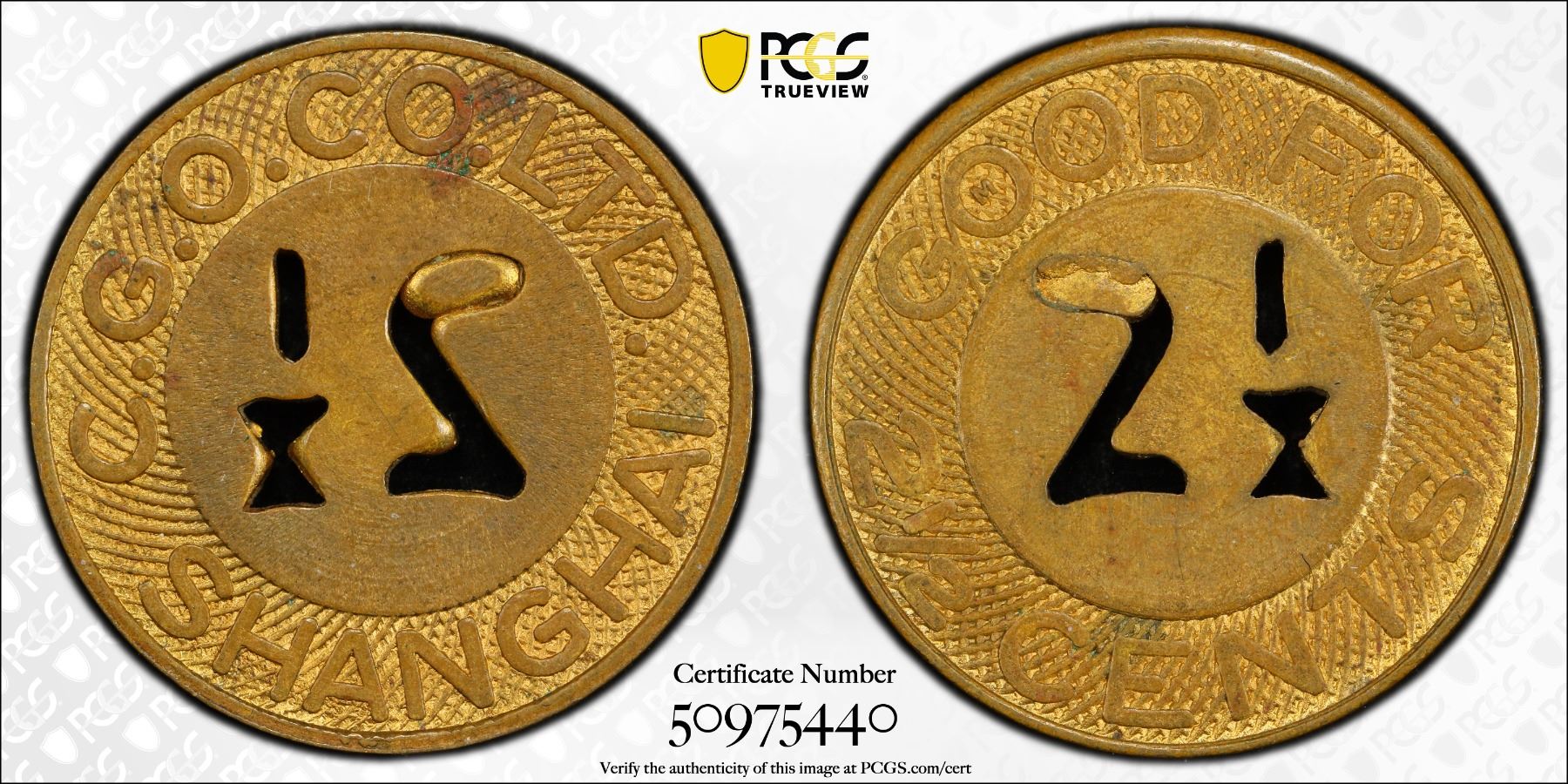 SHANGHAI: 2 1/2 cent token, ND (1926), Lec-A3, Numista-238524, TC-636595, 2nd series, struck in brass circa 1926, error strike with residual metal in punch area, "2 1/2" punched out at center, GOOD FOR / 2 1/2 CENTS around // C. G. O. CO. LTD / SHANGHAI, a pleasing mint state example, PCGS graded MS62. The China General Omnibus Co., Ltd. was a British-owned bus company established in 1923 by H. E. Arnhold, a prominent British businessman and one-time chairman of the Shanghai Municipal Council. The company was registered in Hong Kong but operated exclusively in Shanghai, where it opened to the public in October of 1924. It initially comprised six vehicles and serviced a single 6km route between the Bund and Jing'an Temple within the International Settlement. The company was later acquired by the Sassoon family and expanded to about 20 routes with a total distance of more than 100km. It continued to operate until 1941 due to the looming threat of war and eventually underwent liquidation in 1947.