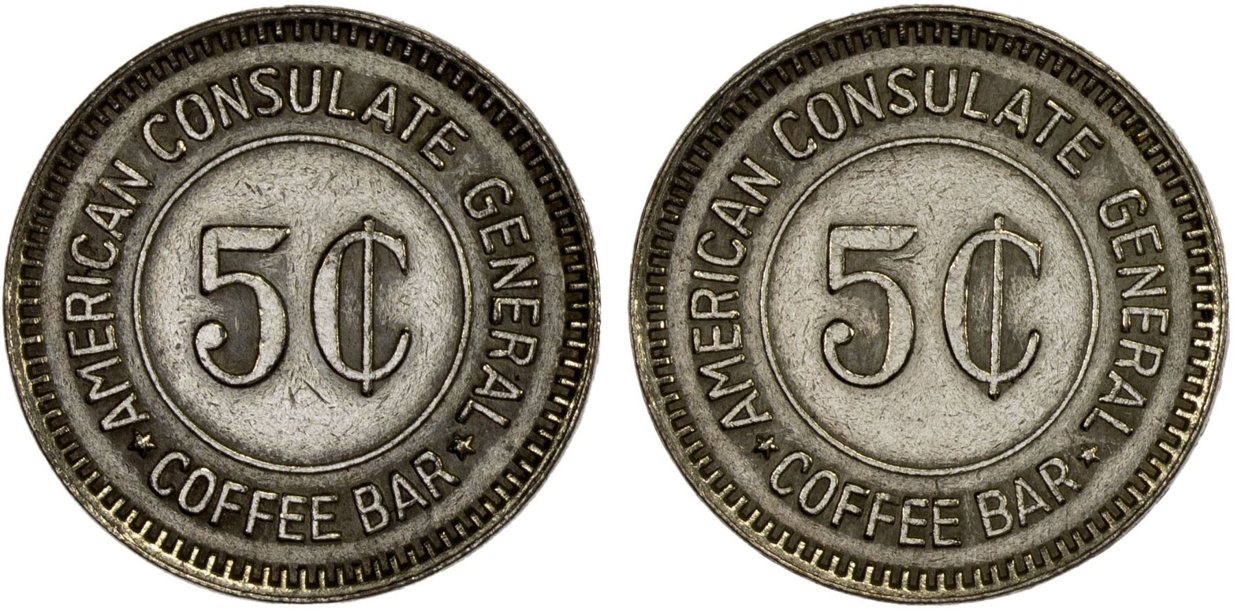 SHANGHAI: 5 cents token (4.55g), ND (ca. 1945-50), Pan Junxiang--, TC--, 21mm, large 5¢ in center circle, AMERICAN CONSULATE GENERAL / COFFEE BAR // same design on reverse, lightly polished, extremely rare, XF. According to the consignor, this token was used at the American Consulate General in Shanghai between the end of WWII and the withdrawal of US diplomatic staff from mainland China in 1950. It was one of ten pieces found in the estate of a Shanghainese woman who once worked at the American Consulate General, located in the Glen Line Building on the Bund at the intersection of today's Zhongshan East Road and Beijing East Road.