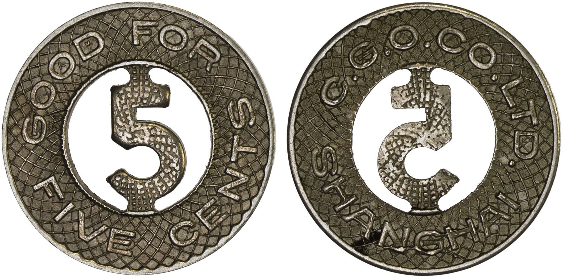 SHANGHAI: 5 cents token, ND (1926), Lec-A4, 2nd series, made in copper-nickel, openwork "5" at center, GOOD FOR / 5 CENTS around // C. G. O. CO. LTD / SHANGHAI, Choice XF.