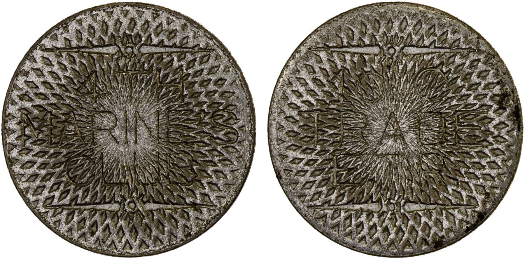 SHANGHAI: phonograph token, ND (ca. 1930's), Pan Junxiang--, TC--, radiating patterns on both sides, overstruck on a 10 cents trade token for E. T. "Jack" Riley's 4th Marine Club, used in one specific phonograph player, XF. According to the consignor, there are about 15-20 of these overstruck tokens known, all found inside the money box of a single phonograph player. About half of them were overstruck on tokens of the 4th Marine Club, with the rest from various other establishments.