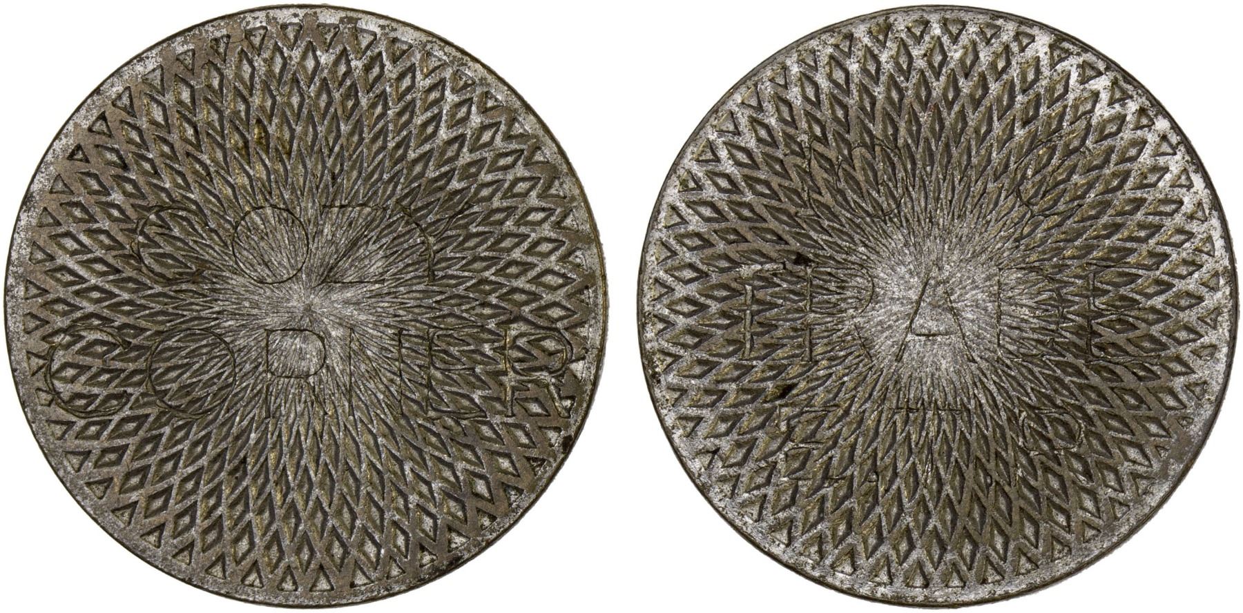 SHANGHAI: phonograph token, ND (ca. 1930's), Pan Junxiang--, TC--, radiating patterns on both sides, overstruck on a 10 cents trade token for E. T. "Jack" Riley's Cozy Corner, used in one specific phonograph player, XF. According to the consignor, there are about 15-20 of these overstruck tokens, all found inside the money box of a single phonograph player. About half of them were overstruck on tokens of the 4th Marine Club, with the rest from various other establishments.
