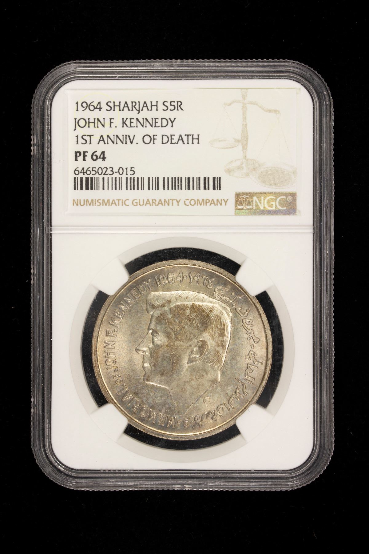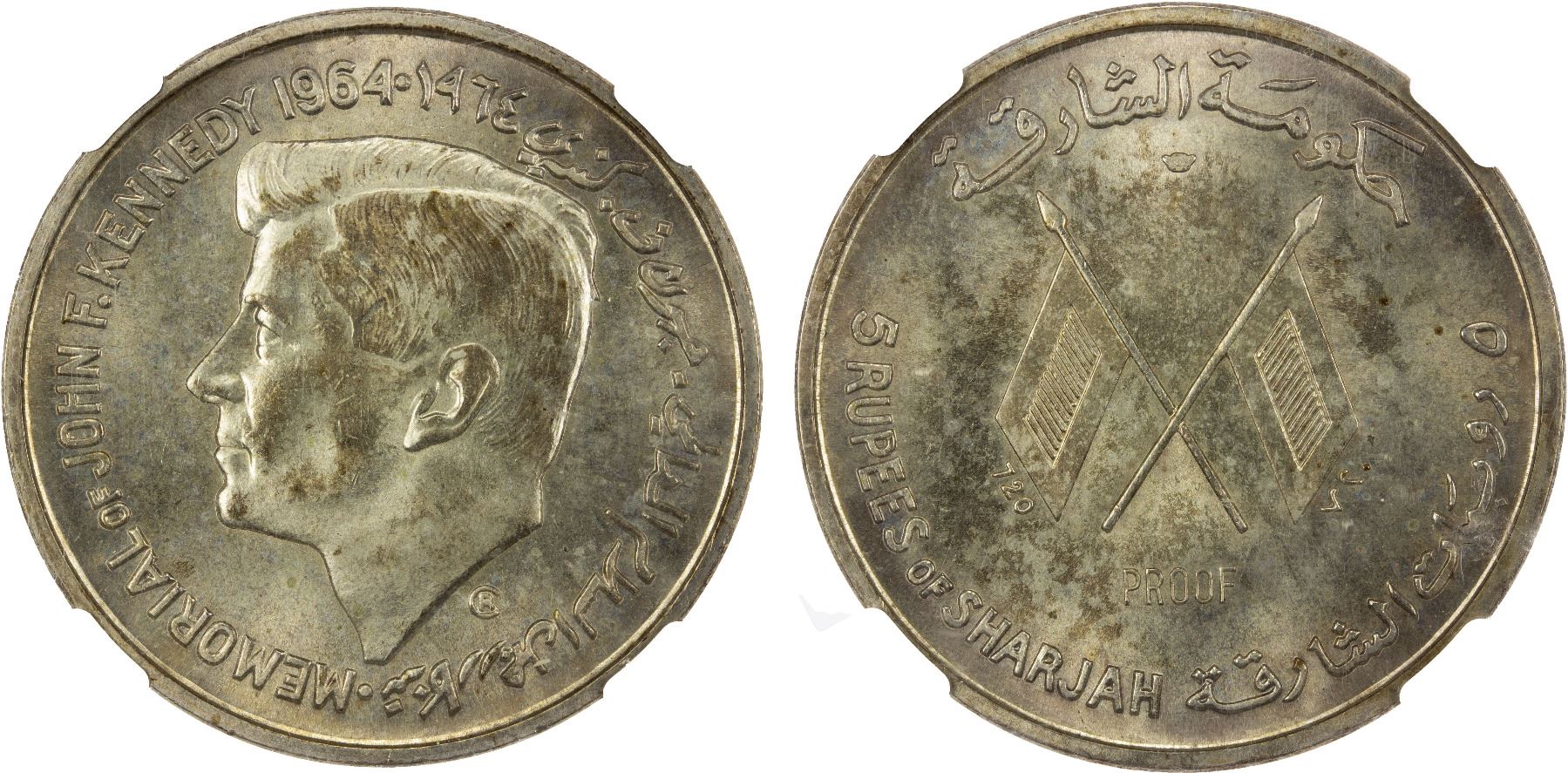 SHARJAH: Saqr Bin Sultan al-Qasimi, 1951-1965, AR 5 rupees, 1964, KM-X1, Memorial for American President John F. Kennedy, includes original presentation box, NGC graded Proof 64.