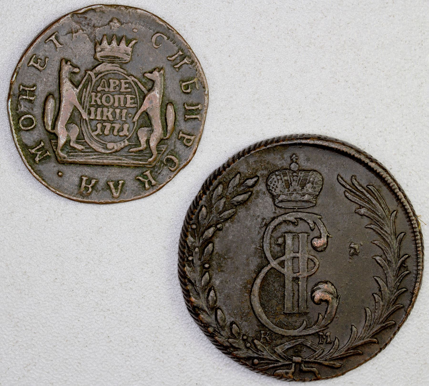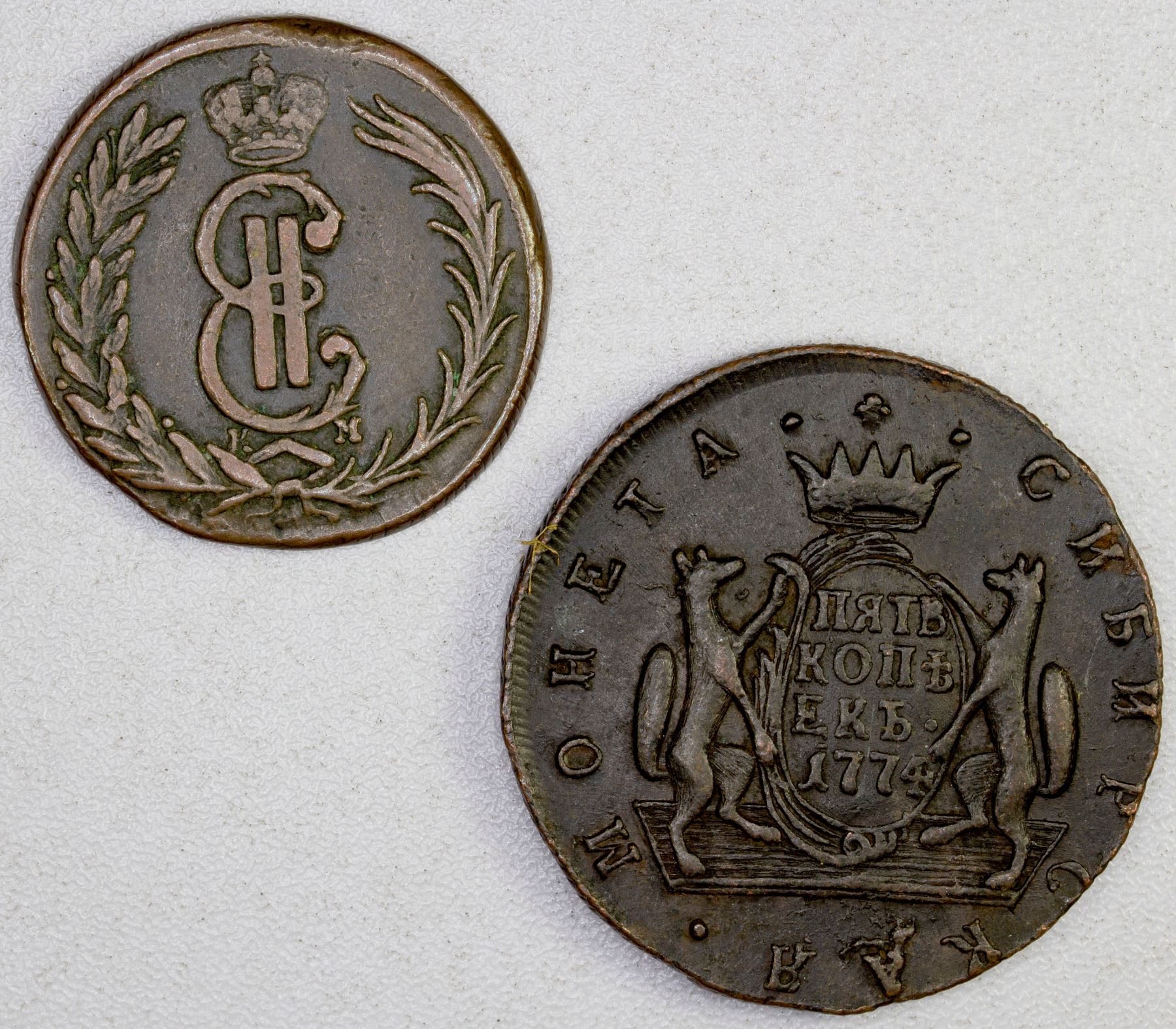 SIBERIA: Russian Imperial Province, LOT of 2 coins, 5 kopecks 1774 and 2 kopecks 1771; retail value $300, lot of 2 pieces, ex Dr. Robert A. Rosenfeld Collection.