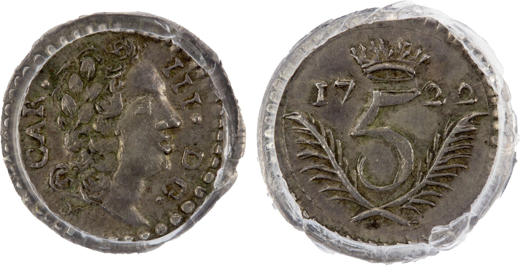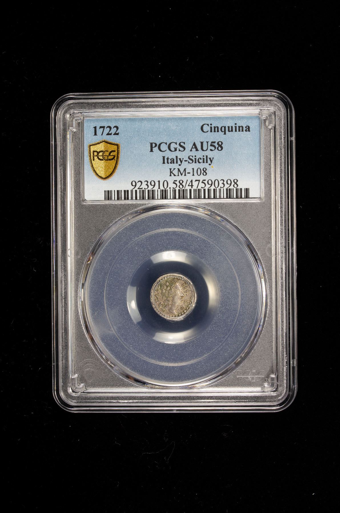 SICILY: Carlo III, 1720-1735, AR cinquina, 1722, KM-108, very rare denomination, an attractive nearly mint state example, PCGS graded AU58, RR.