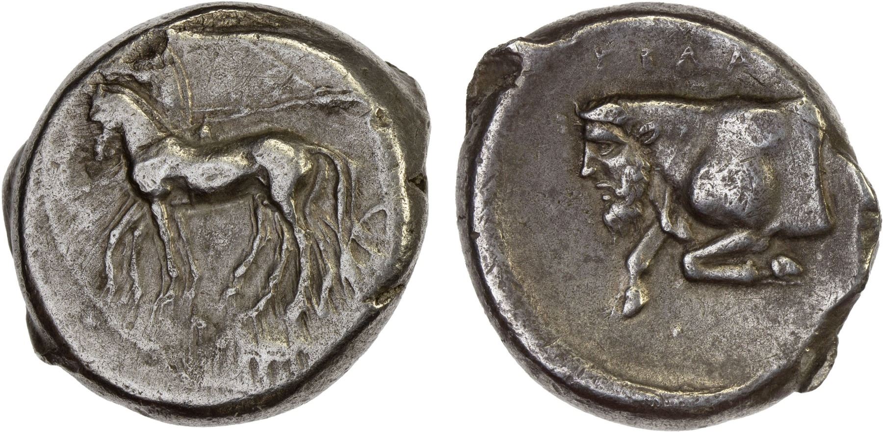 SICILY: Gela, AR tetradrachm (16.84g), ca. 420-415 BC, Jenkins-469, SNG Copenhagen 270, charioteer driving quadriga left // forepart of man-headed bull left, ΓEΛA[Σ] above, VF, ex Leu Numismatik Web Auction 28, Lot 611.