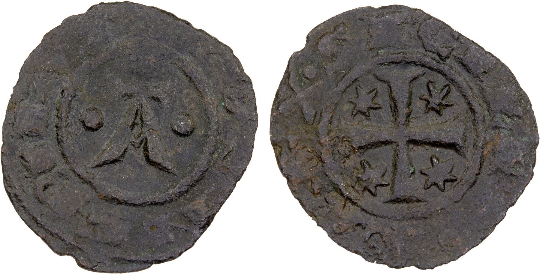 SICILY: Manfredi, 1258-1266, BI denaro (0.46g), Spahr-193, "o A o" in obverse center, MAVNFRVDIS around // cross, stars in the angles, REX SICILIE around, VF, R. Assigned by Spahr to the mint of Brindisi.