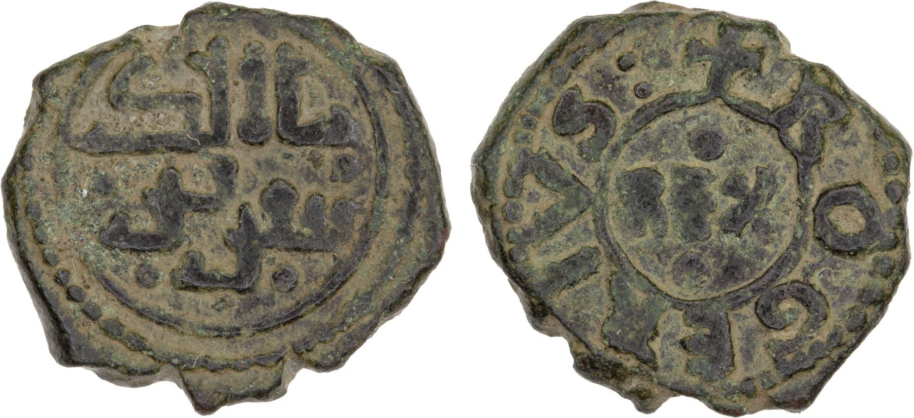 SICILY: Tancred, 1189-1194, AE follaro (2.00g), Spahr-139, al-malik tancred in Arabic (The King Tancred) // citing his son Roger in Latin rogerius rex, superb strike and well centered, lovely patina, VF, S, ex SARC Auction 12, Lot 1641.
