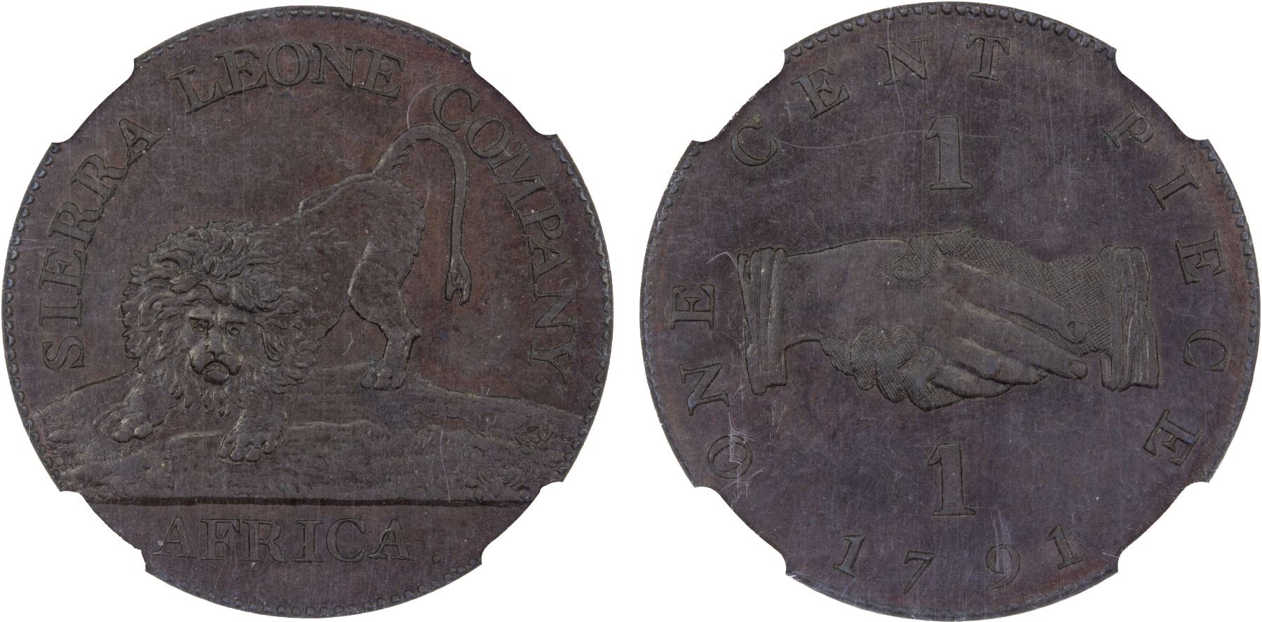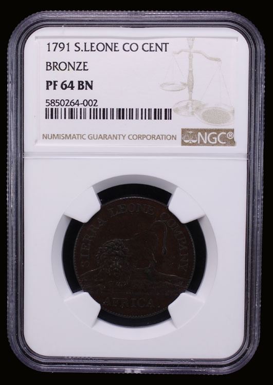SIERRA LEONE: Freetown Colony, AE cent, 1791, KM-1, Sierra Leone Company issue, struck in bronze at the Soho Mint in Birmingham, a wonderful proof quality example! NGC graded Proof 64 BN. The Freetown Colony (1792-1808) was the foundational period for modern Freetown, Sierra Leone, established by the Sierra Leone Company as a settlement for Nova Scotian Black Loyalists and freed American slaves, and later Jamaican Maroons.The 1791 Sierra Leone coins, commissioned by the Sierra Leone Company, were actually struck later, primarily in 1793, by Matthew Boulton's Soho Mint in England, with some proofs struck as late as 1799; the date 1791 signifies the founding of the Company, not the minting date.
