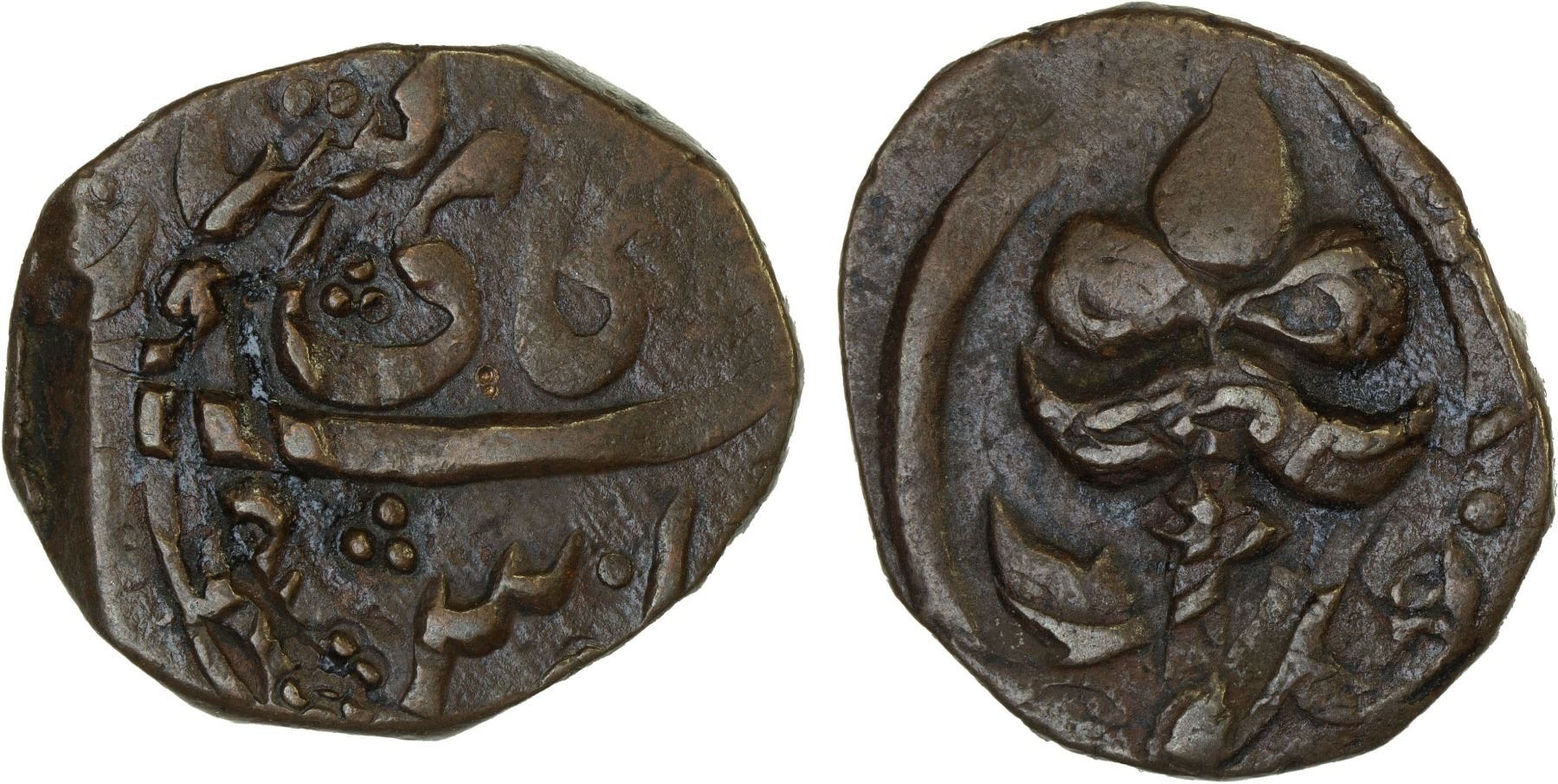 SIKH EMPIRE: AE falus (9.11g), Alkai Peshawar, AH(1265), KM-99, Herrli-13.05.11, 5-petal flower // Persian legend; alkai means "district"; overstruck on older type of Peshawar, with the mint name of the host coin visible on the obverse, bold VF, R.