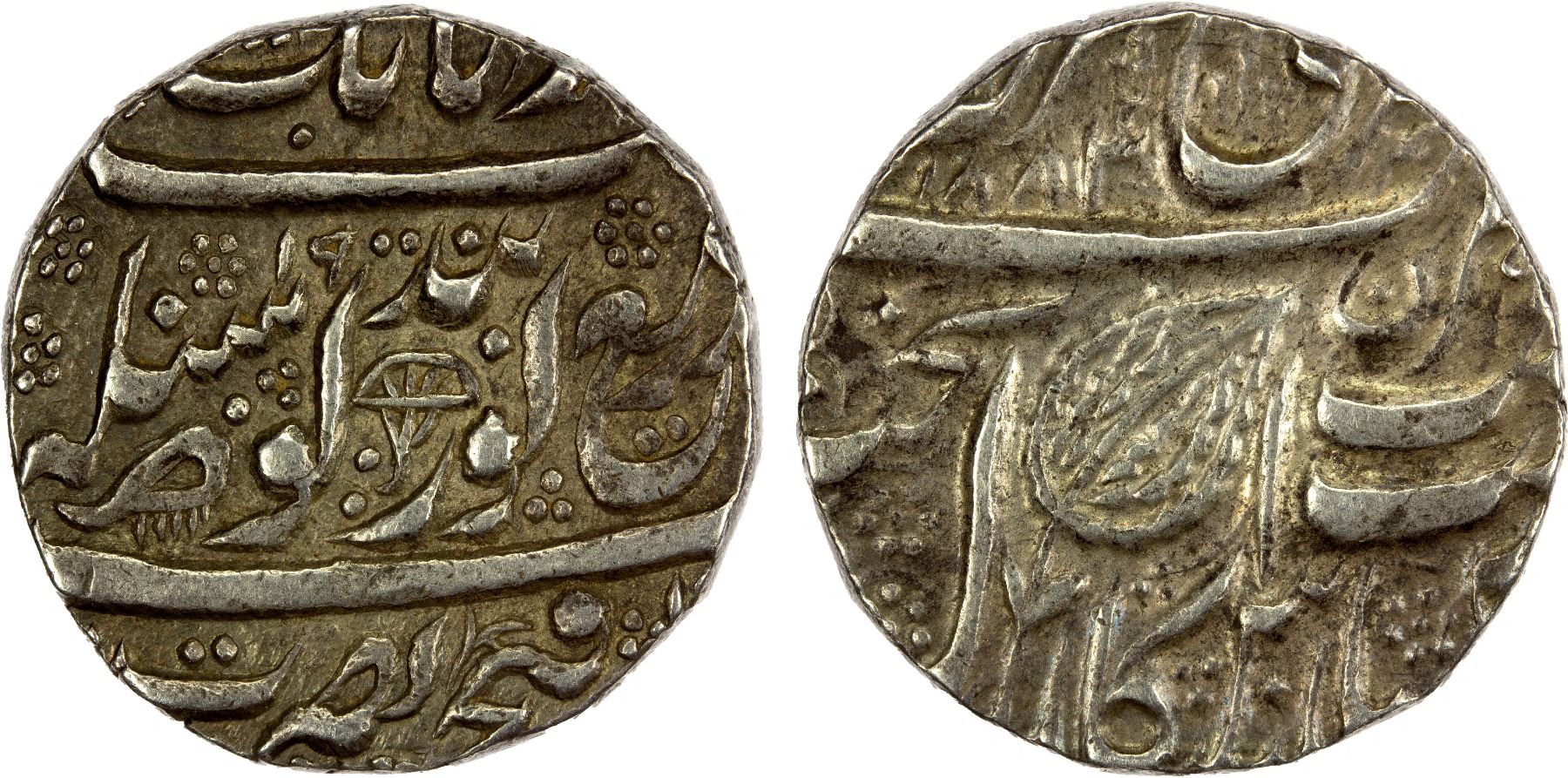 SIKH EMPIRE: AR gobindshahi rupee (11.10g), Amritsar, VS1900, KM-21.2. Herrli-01.22.04, VS1884 series; "parachute" symbol in obverse center, strong EF, R. The "parachute" is surely a simplified version of the chhatra (umbrella) on the nanakshahi rupees dated VS1899-1901 (KM-22.6).