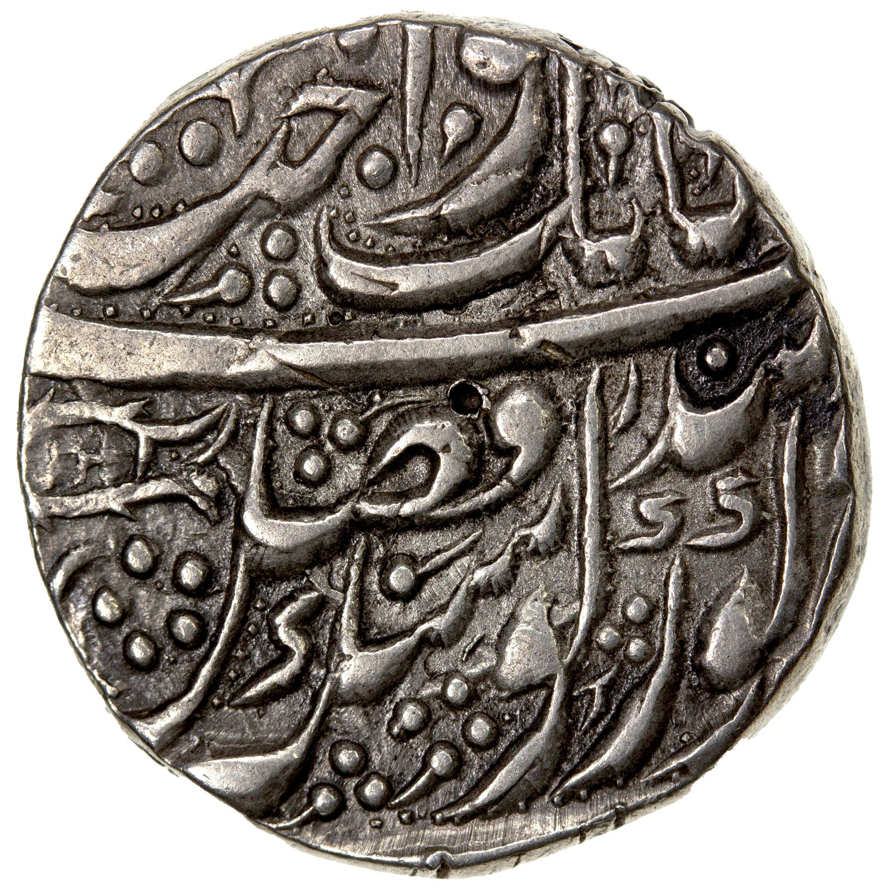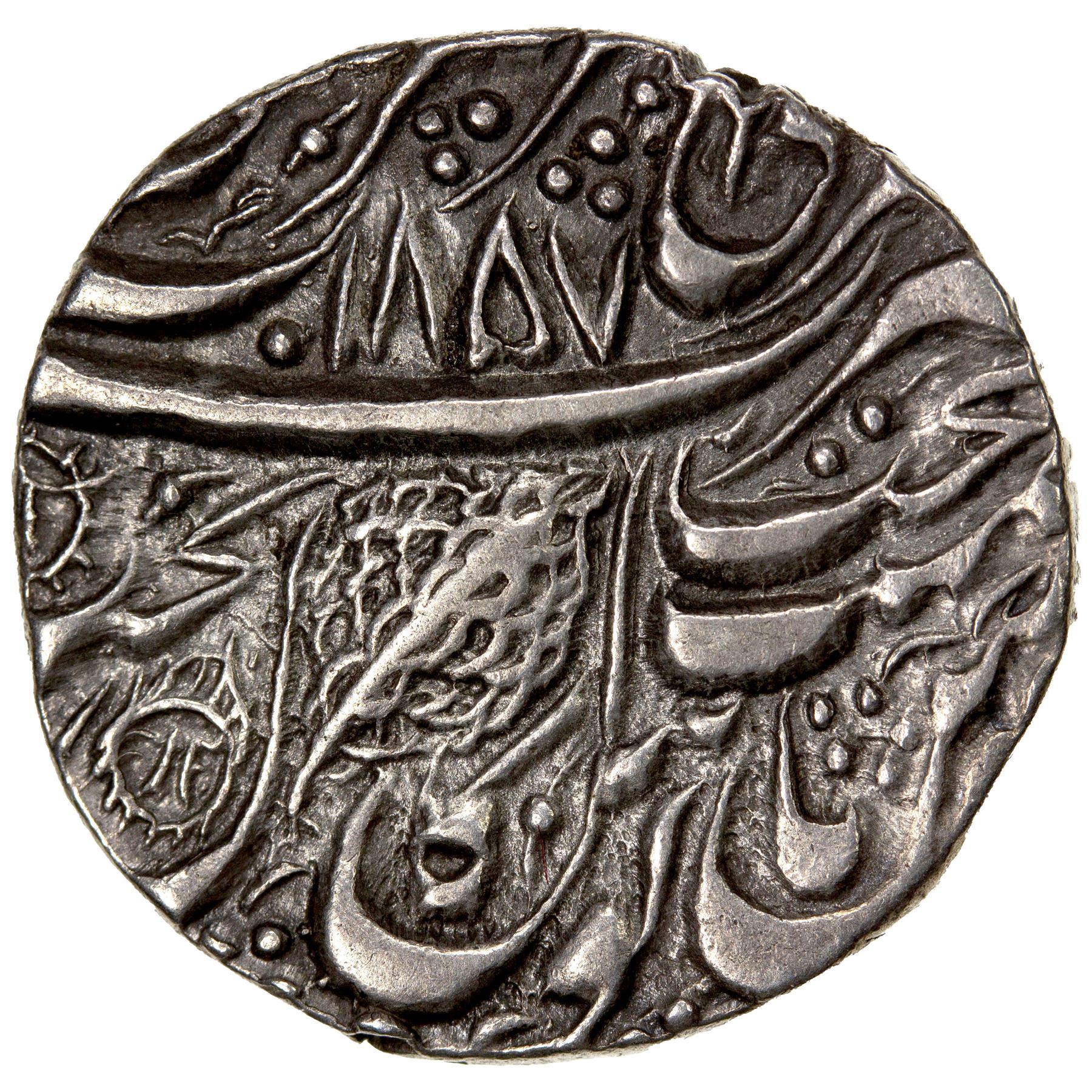 SIKH EMPIRE: AR nanakshahi rupee (11.14g), Amritsar, VS1857, KM-20.1, Herrli-01.07.04, Gurprit-22.05, fish left of fadl on obverse face-like image in the "L" of akal, one tiny testmark, choice EF, ex Jess A. Yockers Collection.