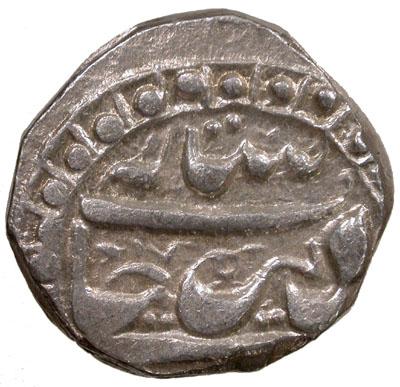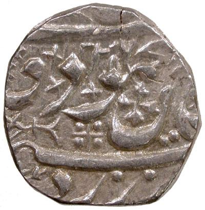SIKH EMPIRE: AR rupee (10.88g), Derajat, AH"12387", Herrli-07.01.04, A-B3142, in the name of the Durrani Mahmud, Extremely Fine. Two tiny pellets instead of regnal year on reverse. The date is AH1238, but the engraver neglected to remove the number 7, hence "12387".