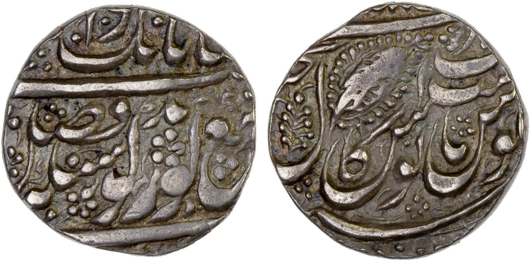 SIKH EMPIRE: AR rupee (11.14g), Amritsar, DM, KM-20.1, Herrli-01.07.04, special form of the leaf on the reverse, used only VS1858-1859, VF-XF.