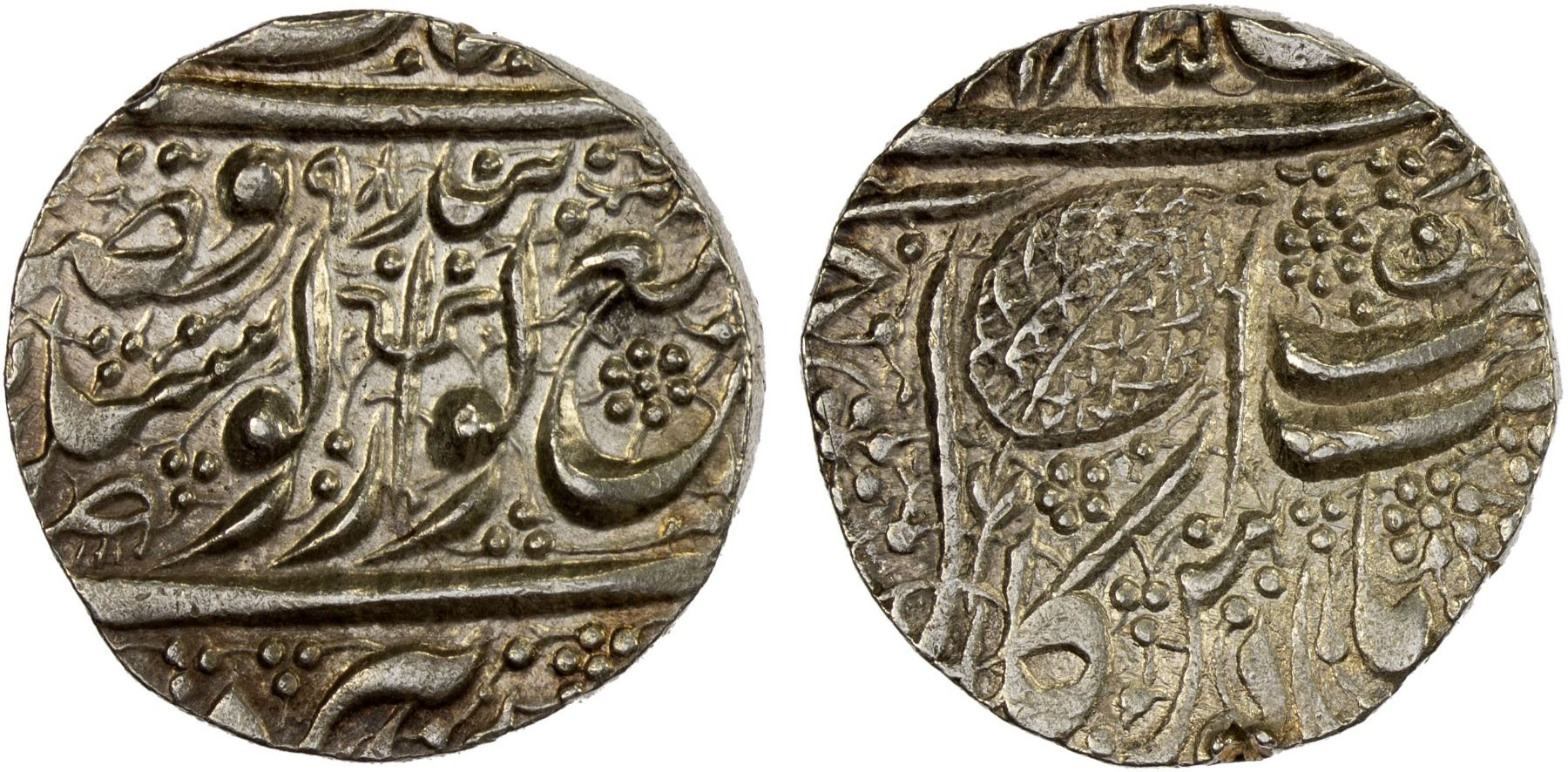 SIKH EMPIRE: AR rupee (11.14g), Amritsar, VS[18]98, KM-22.5, Herrli-01.11.04, VS1885 series, with trisul in the obverse center; 1 banker's mark on the edge; wonderful bold strike, AU.
