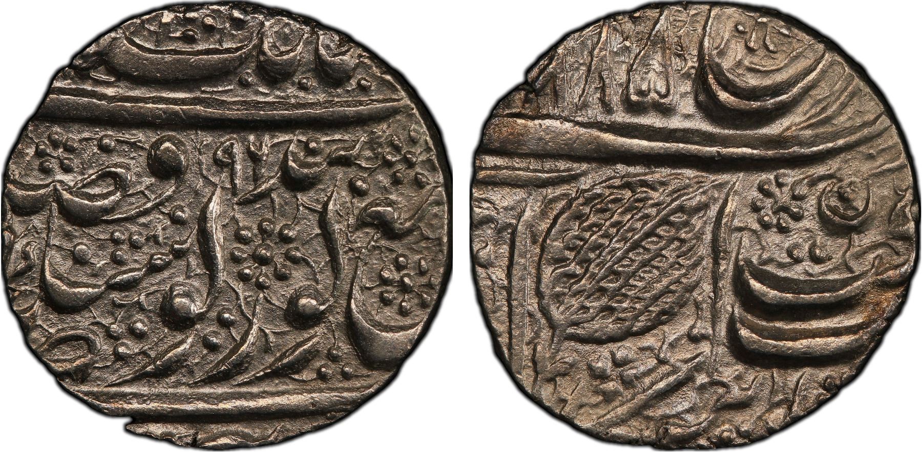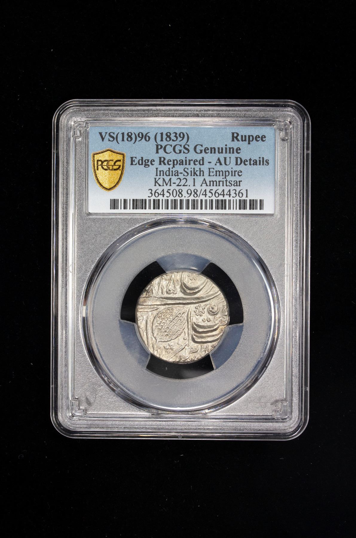 SIKH EMPIRE: AR rupee, Amritsar, VS[18]96, KM-22.1, frozen date VS1885, edge repaired, still a lustrous example, PCGS graded About Unc details.