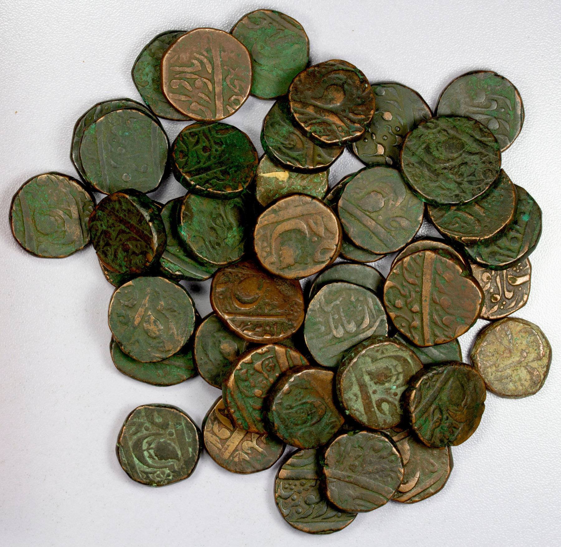 SIKH EMPIRE: LOT of 45 copper paise, type KM-4, Herrli-01.30.11, Persian language both sides, a few with legible date VS1880 or 1881; average Fine, most with some weakness or other flaws; retail value $900, lot of 45 pieces.