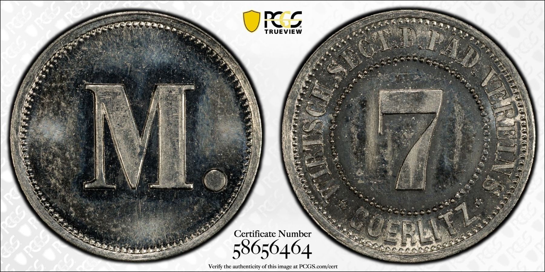 SILESIA: 7 pfennig (2.41g), ND, Menzel-11575.1, 21 zinc toke,n, WIRTSCH. SECT. D. PÄD. / VEREINS GÖRLITZ around numeral 7 // letter M, a wonderful mint state example! PCGS graded MS64. Zgorzelec (Görlitz)is today a town in Lower Silesian Voivodeship, in southwestern Poland.
