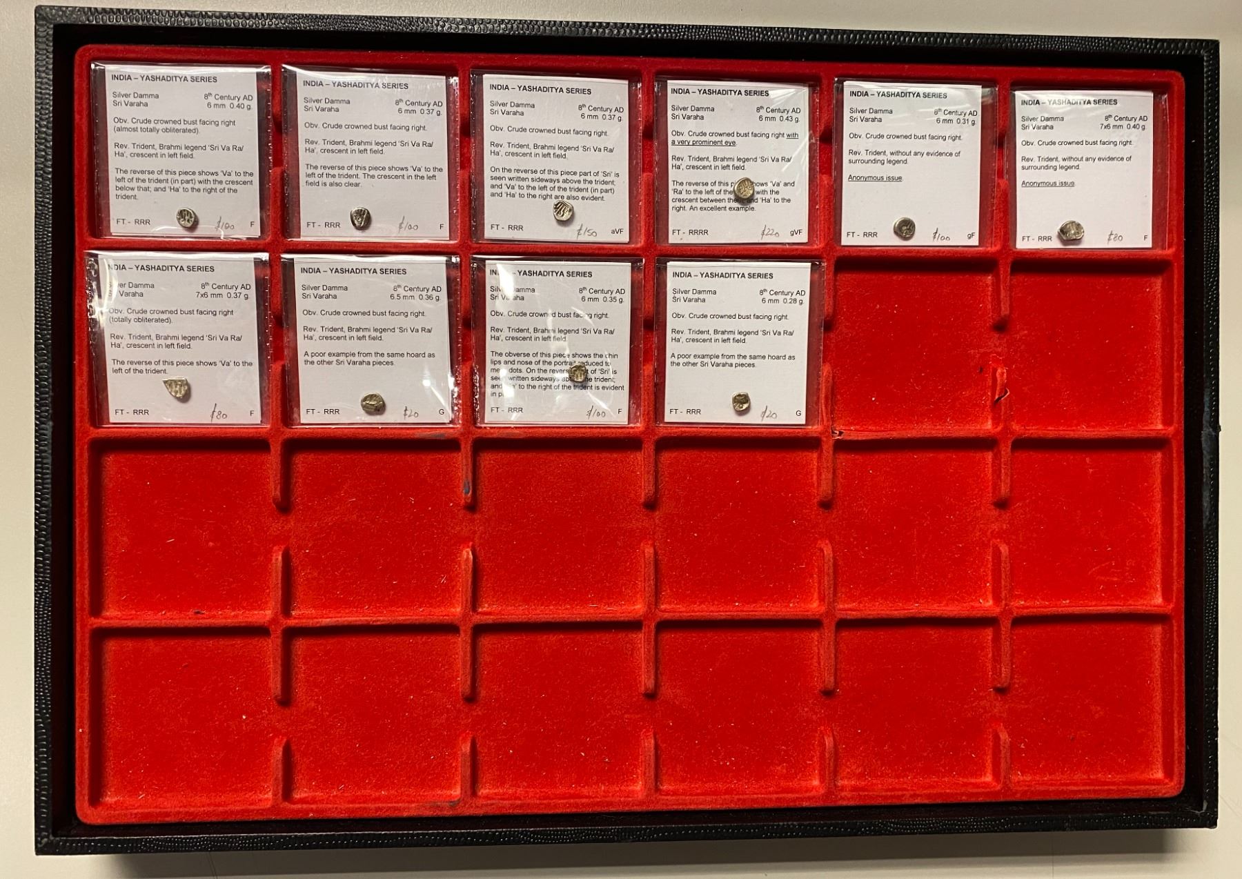 SIND: YASHADITYA SERIES: LOT of 10 silver dammas, Sri Varaha, 8th century, traces of bust right // trident with traces of circulat Brahmi legend around (sri va ra ha), struck on thick narrow flans, average 6mm diameter; average circulated grades, all with some weakness or flatness, all with Todd's full descriptions; retail value $400, lot of 10 pieces, ex Ian Todd Collection. Previously unknown type, published by Fishman, Todd, and Pieper, in "Numismatische Zeitschrift" #127, pp. 389-397.