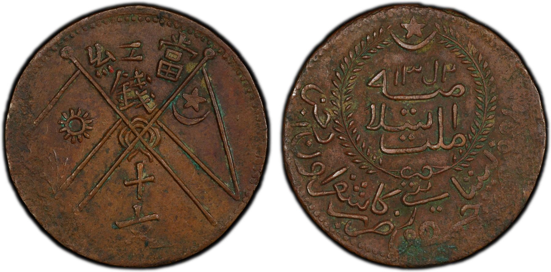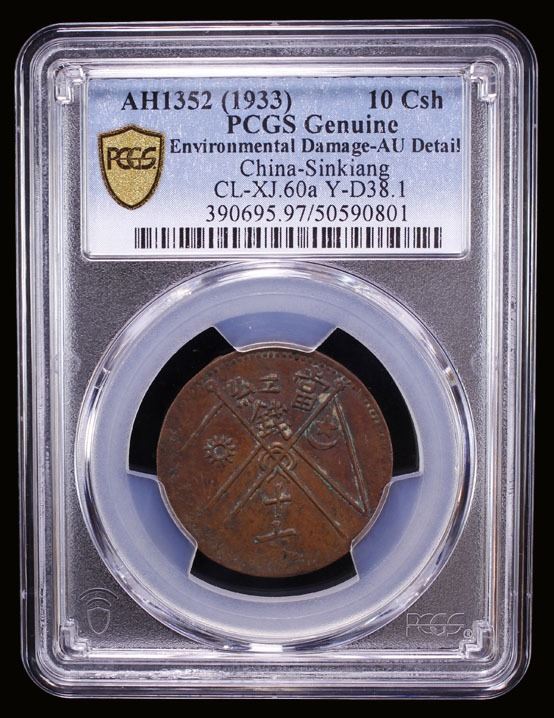 SINKIANG: Hoja Niyaz Haji, 1933-1934, AE 10 cash, Kashgar, AH1352, Y-D38, CL-XJ.60a, Hijri date within wreath, sharket turkhestan cumhuriyet islamiyesi ("Islamic Republic of East Turkistan") below // crossed flags, denominations in Chinese above and Turki below, environmental damage, bold strike for type, PCGS graded AU details. The First East Turkistan Republic, officially the Islamic Republic of East Turkistan, was a short-lived breakaway would-be Islamic republic founded on November 12, 1933. It was centered on the city of Kashgar in what is today the Xinjiang Uyghur Autonomous Region in China. With the sacking of Kashgar in 1934 by Hui warlords nominally allied with the Kuomintang government in Nanjing, the First East Turkistan Republic was effectively eliminated.