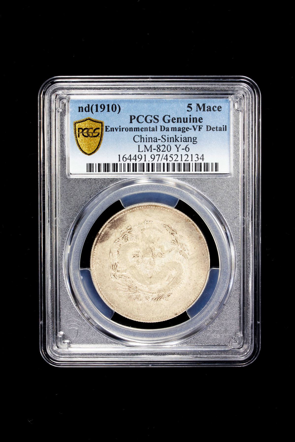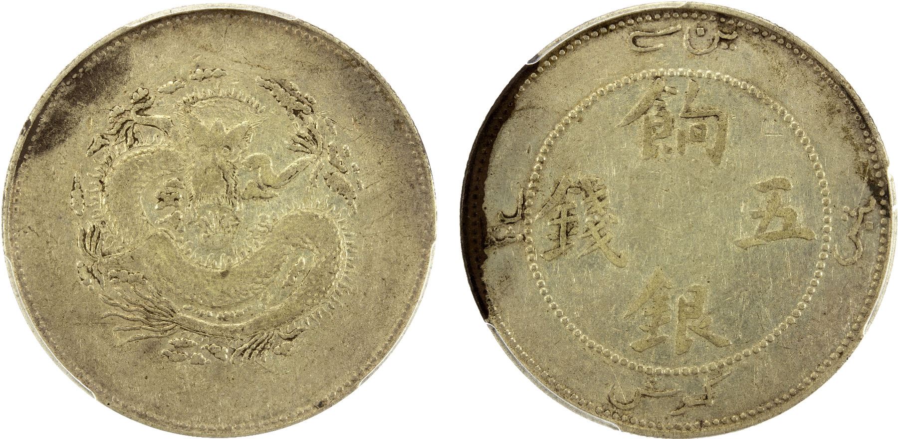 SINKIANG: Hsuan Tung, 1909-1911, AR 5 miscals, ND (1910), Y-6, L&M-820, variety with uncircled dragon, environmental damage, PCGS graded VF Detail.