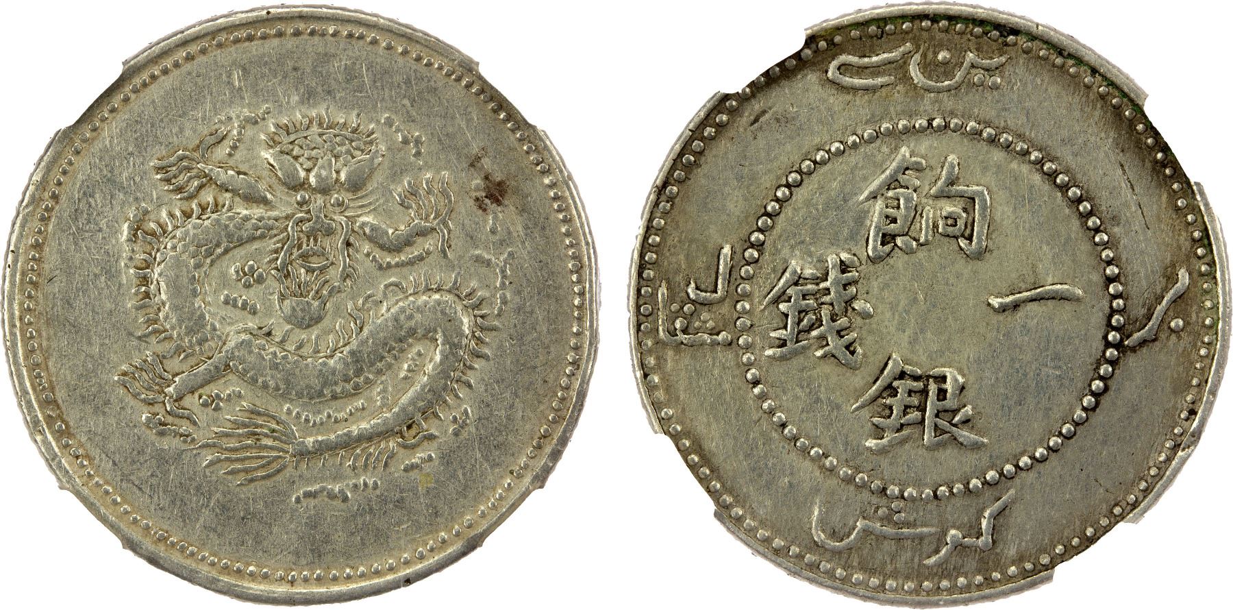 SINKIANG: Imitative Type, AR miscal, ND, Y-3, cf. L&M-826, facing imperial dragon // xiang yin yi qian in Chinese, bir miscal yeni gümüsh ("one miscal new silver") in Uyghur, NGC graded AU55, ex Dr. Dirk Löer Collection. It is uncertain when this imitative type was struck.