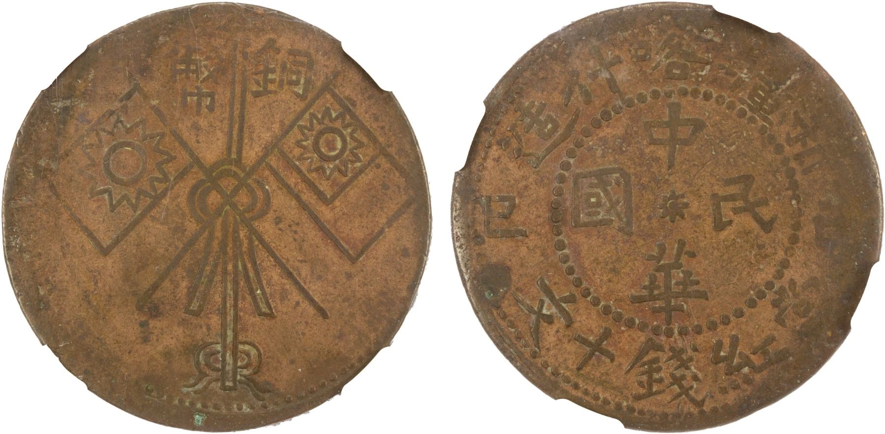SINKIANG: Republic, AE 10 cash, Kashgar, CD1929, Y-44A.1, crossed Nationalist and Kuomintang flags, NGC graded VF30 BN.