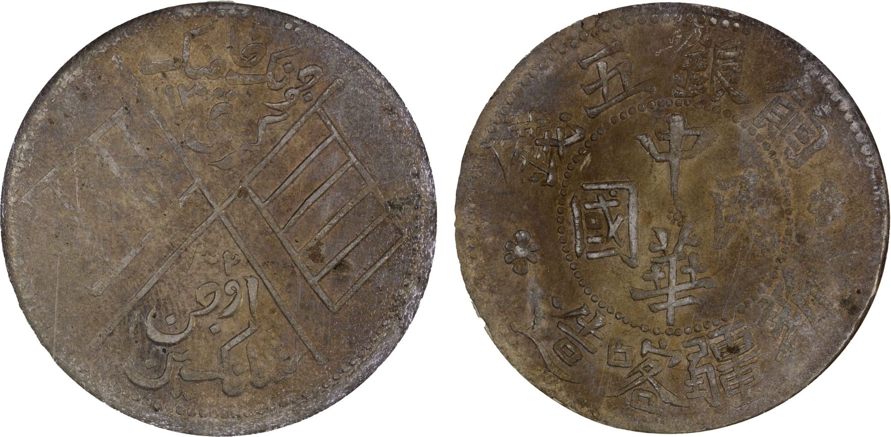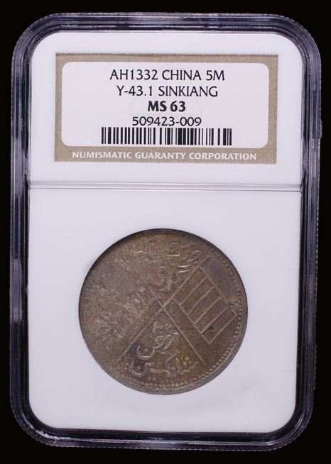 SINKIANG: Republic, AR 5 miscals, AH13-32, Y-43.1, crossed vertical Five-colored flags, natural toning, NGC graded MS63, ex The 1914 Collection.