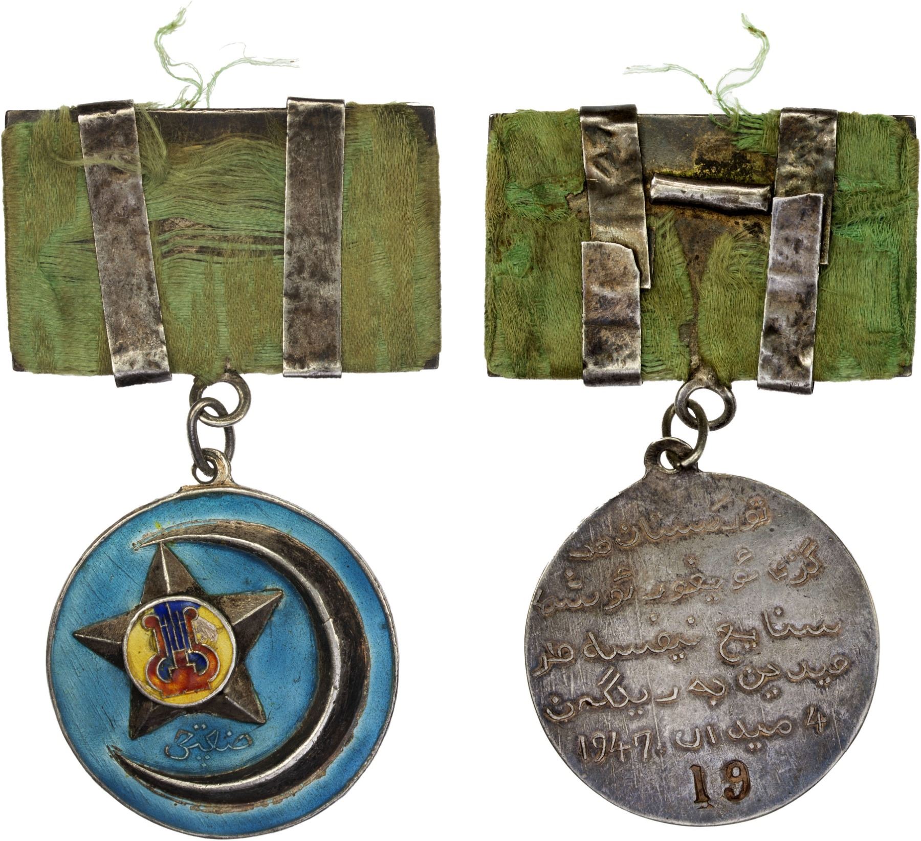 SINKIANG: Second East Turkistan Republic, enameled AR medal, 1947, 34mm, Artist's Medal, with original loop and green ribbon with silver bands and pin holder, large star and crescent in light blue field, the word sen'etçi ("artist") in between, circle on star, emblazoned with red lyre in blue and yellow field // machine-struck Uyghur legend in relief: turkistan merkizi uyghur uyushma sanayi nepisiye medalidin berilgen 4 medal ("the 4th medal awarded by the Turkistan Central Uyghur Fine Arts Union") followed by date, with punched issue number (19) below, one small enamel chip, ribbon with moderate fraying, hairlines on reverse, XF, RRRR. This is the first example of the Artist's Medal of the Second East Turkistan Republic (ETR) to appear in the West and only one of two in existence that we are aware of. According to the consignor, this medal was acquired in the Ili area from the descendants of the late original recipient, who refused to sell it during his lifetime due to its significance and rarity, as evidenced by the very low issue number. The owner of the other medal (with the issue number 6) relates a similar story, as he acquired his example from a retired army musician who played the flute in the East Turkestan National Army before immigrating to Uzbekistan in the 1960's. According to the musician, his medal was one among eleven personally presented by Ehmetjan Qasimi (1914-1949), the Minister of Foreign Affairs, in Ghulja in 1947. The number 4 on the medal suggests this award was created in 1944, the same year when the ETR was proclaimed. However, it is unclear if any similar medals were produced in these previous years. According to one source, all awards of the ETR were made by Agzam Mirrakhimov, an ethnic Kyrgyz hereditary jeweler born in Ghulja in 1922. See stanradar.com/news/full/20964-nagrady-vostochno-turkestanskoj-respubliki.html for more details.The Second East Turkistan Republic (1944-1949) was a Soviet-aligned separatist state based in Ghulja (Yining) in northern Xinjiang. It declared independence on November 12, 1944, after the outbreak of rebellion in the districts of Ili, Tarbagatay (Tacheng), and Altay. Though initially supported by the Soviet Union, the republic lost its sponsor in 1945 and entered into a coalition government with the Kuomintang government, which controlled the rest of Xinjiang. This uneasy coalition lasted a little over a year and collapsed in 1947. In 1949, following the defection of the KMT provincial government to the advancing Chinese Communist forces, the top leaders of the Republic travelled to Alma-Ata (Almaty), where they were instructed by Soviet officials to cooperate with the Chinese Communists on the integration of the three districts into the rest of Xinjiang. They then set off for Beijing for negotiations, but their plane crashed near Lake Baikal on August 27, killing all onboard. The remaining leadership in Ghulja soon agreed to the integration plans, and the three districts officially became the Ili Kazakh Autonomous Region in 1953.