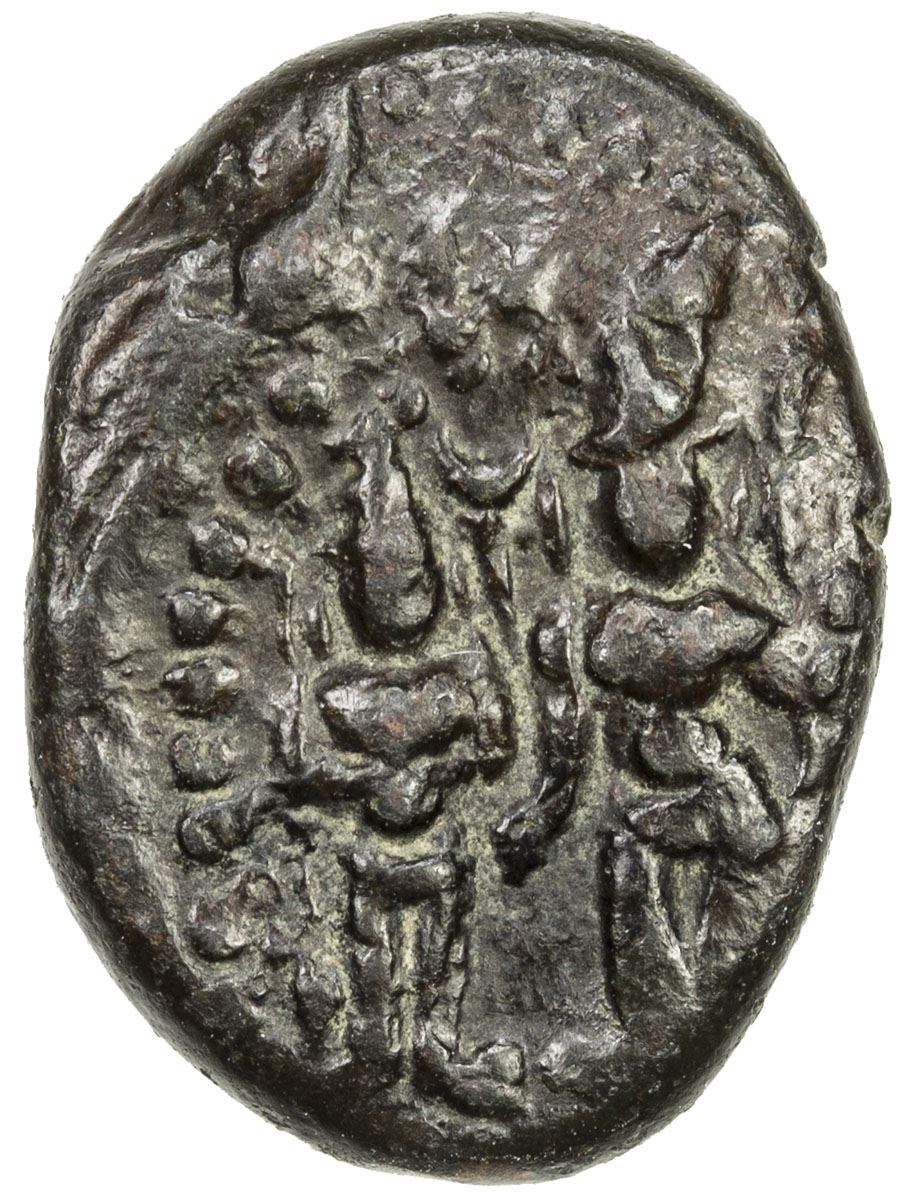 SIVAGANGA: Anonymous, 1743-1801, AE kasu (3.31g), KM-5, Lord Rama and his brother Lord Laxman // crude lingam (Shiva Linga) on altar within dotted circle, a lovely example! VF to EF.