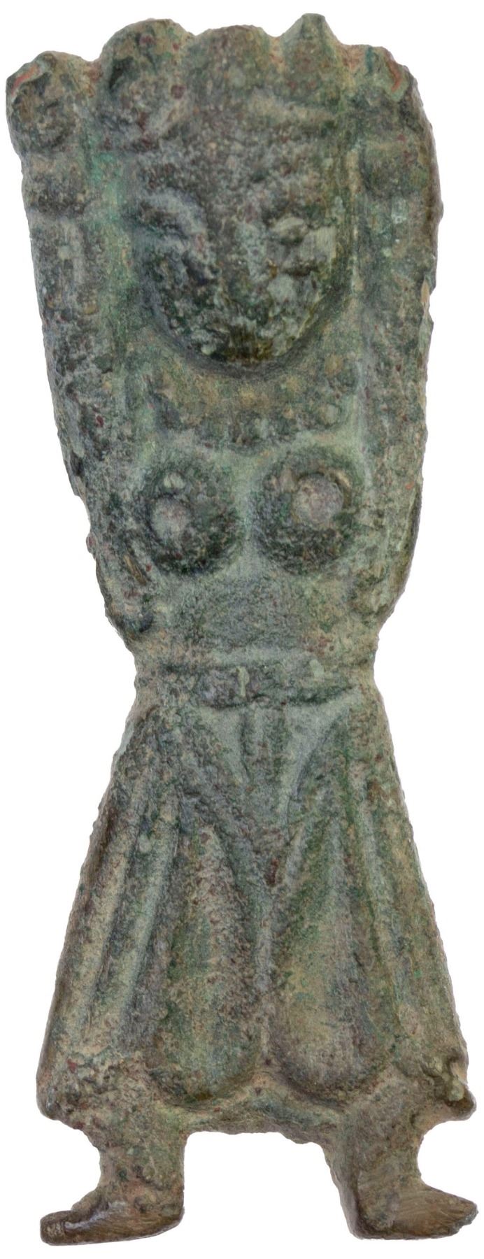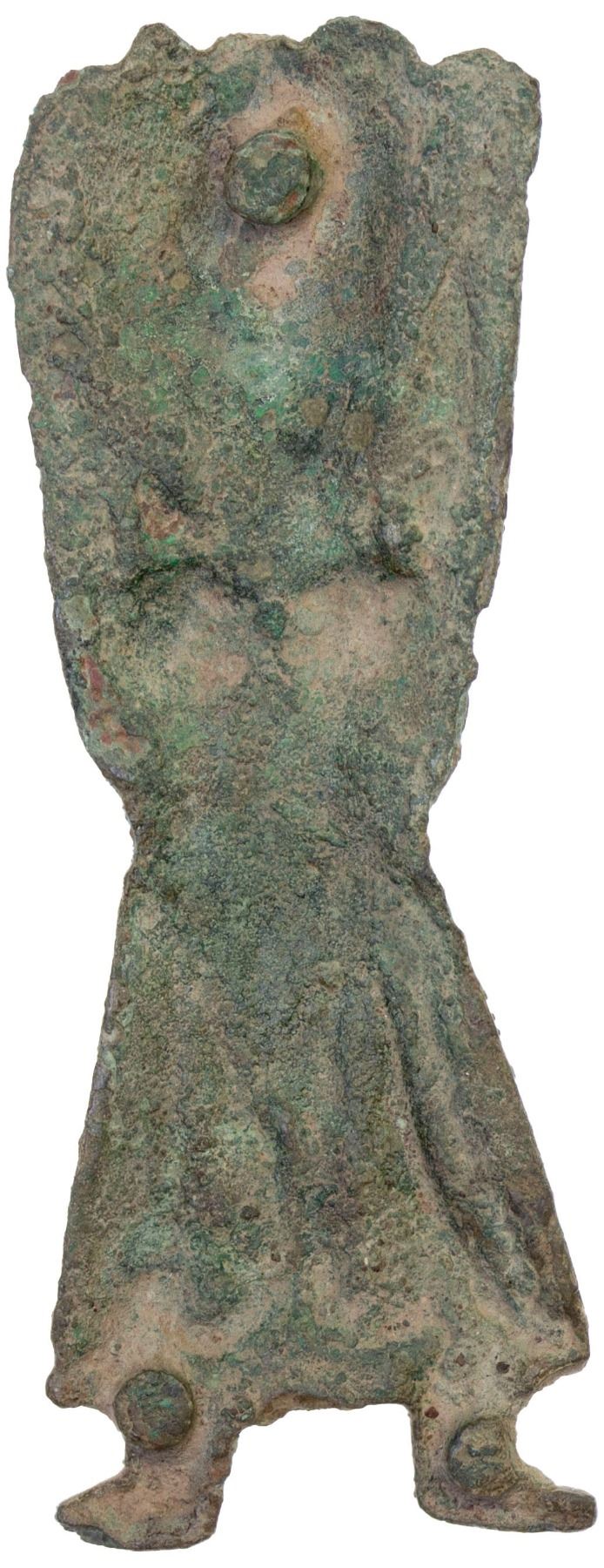 SOGDIANA: AE decorative object, ca. 9th-13th century (5.00g), 45 x 15 mm, woman standing facing, wearing headdress and long dress, her arms raised behind her head, uniface, VF-XF.