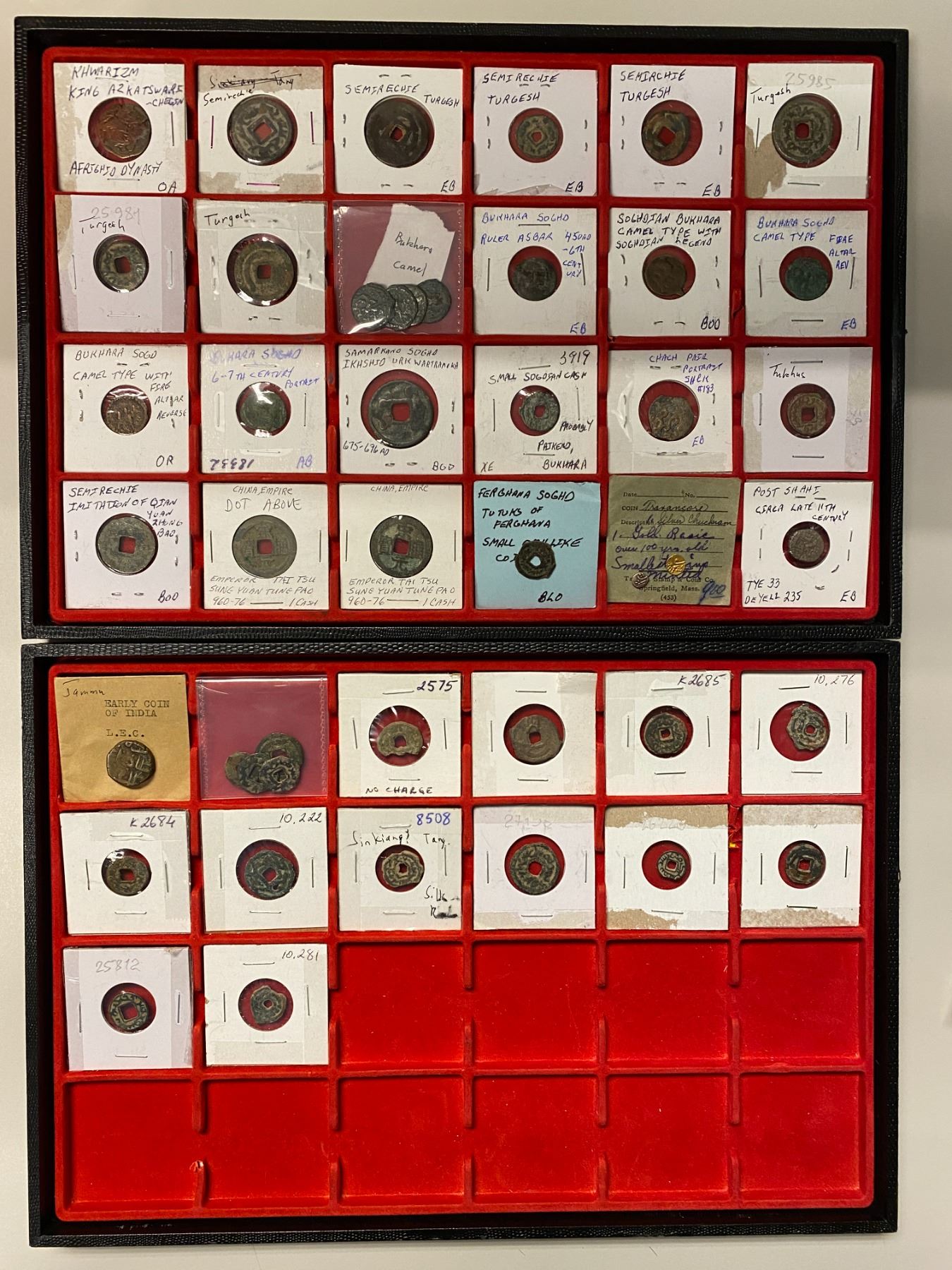 SOGDIANA: LOT of 44 copper cash coins, including Bukhara (9 pcs), Samarkand (1), Paikend (1), Chach (1), Ferghana (1), Khwarizm (1, poor), Semirech'e (8, various subtypes), and Chinese cash (described as Sogdian imitations by the consignor, not confirmed), all with the consignor's attributions or our additions, average VG condition, plus 16 unidentied pieces (probably mostly of Semirech'e, average Good to VG condition, many with weakness or other damage), plus 3 Indian coins of minimal value; retail value $750, lot of 44 pieces.
