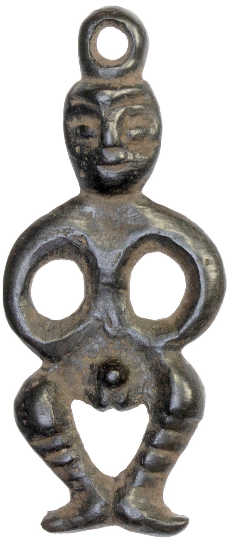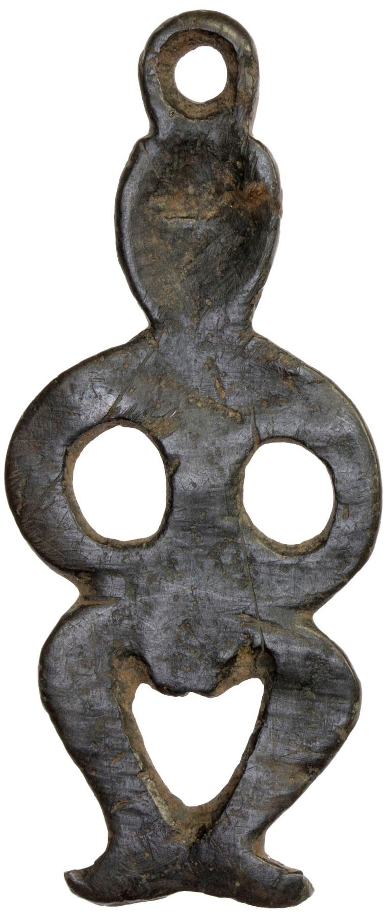 SOGDIANA: bronze charm (4.27g) (42 x 18 mm) male figure, legs separated as through seated, arms akimbo, suspension loop attached above the head; superb example; uniface, XF, RR.