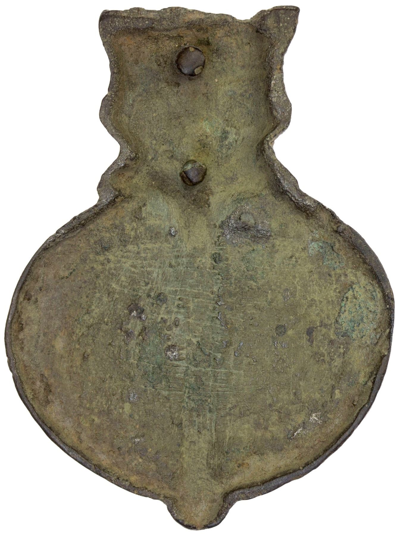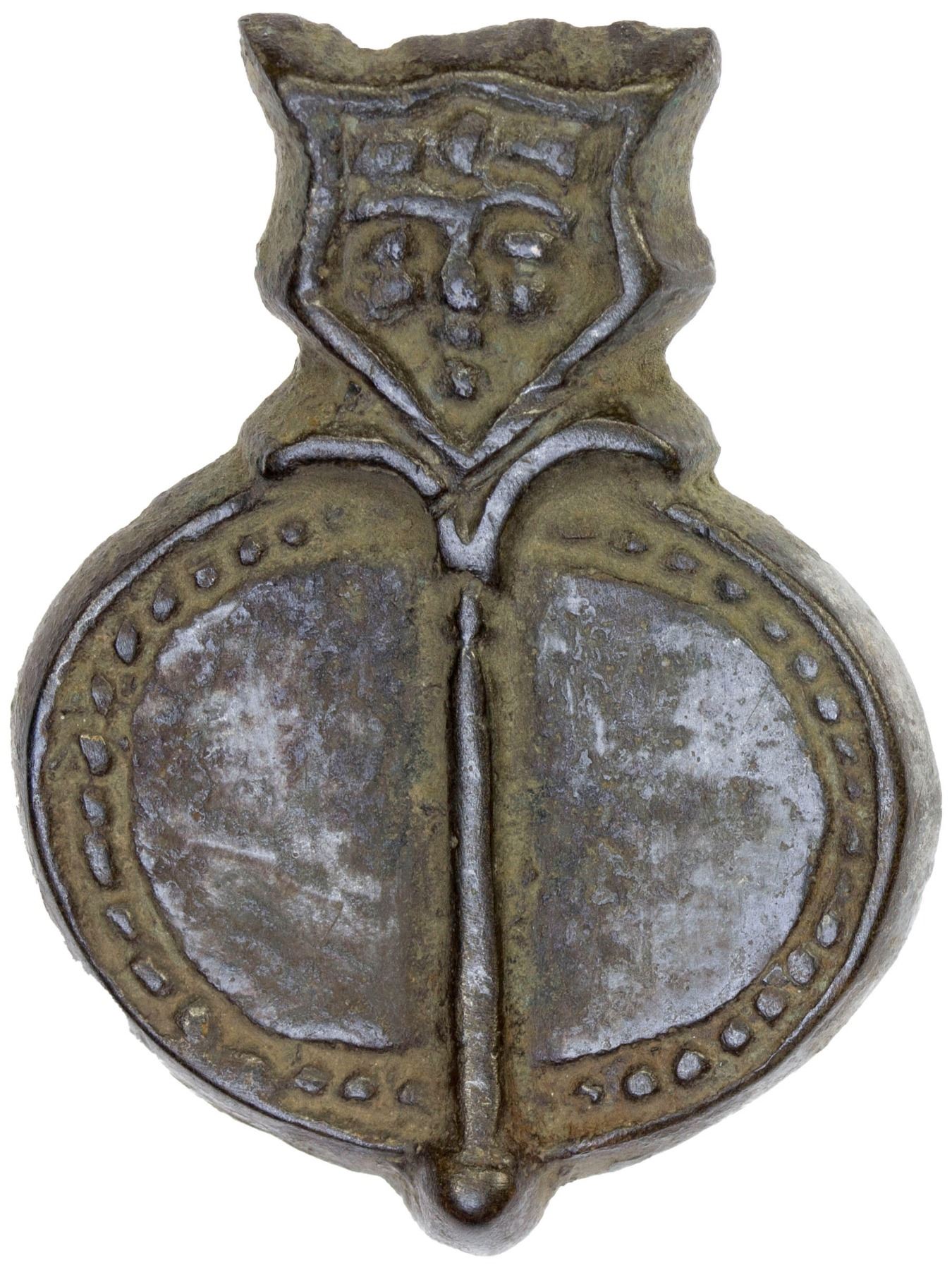 SOGDIANA: bronze decorative (8.35g) (40 x 30 mm) crowned human head atop a pin attached to an oval object (perhaps a kitchen bowl); uniface, but with two points for attachment, VF-XF, RR.