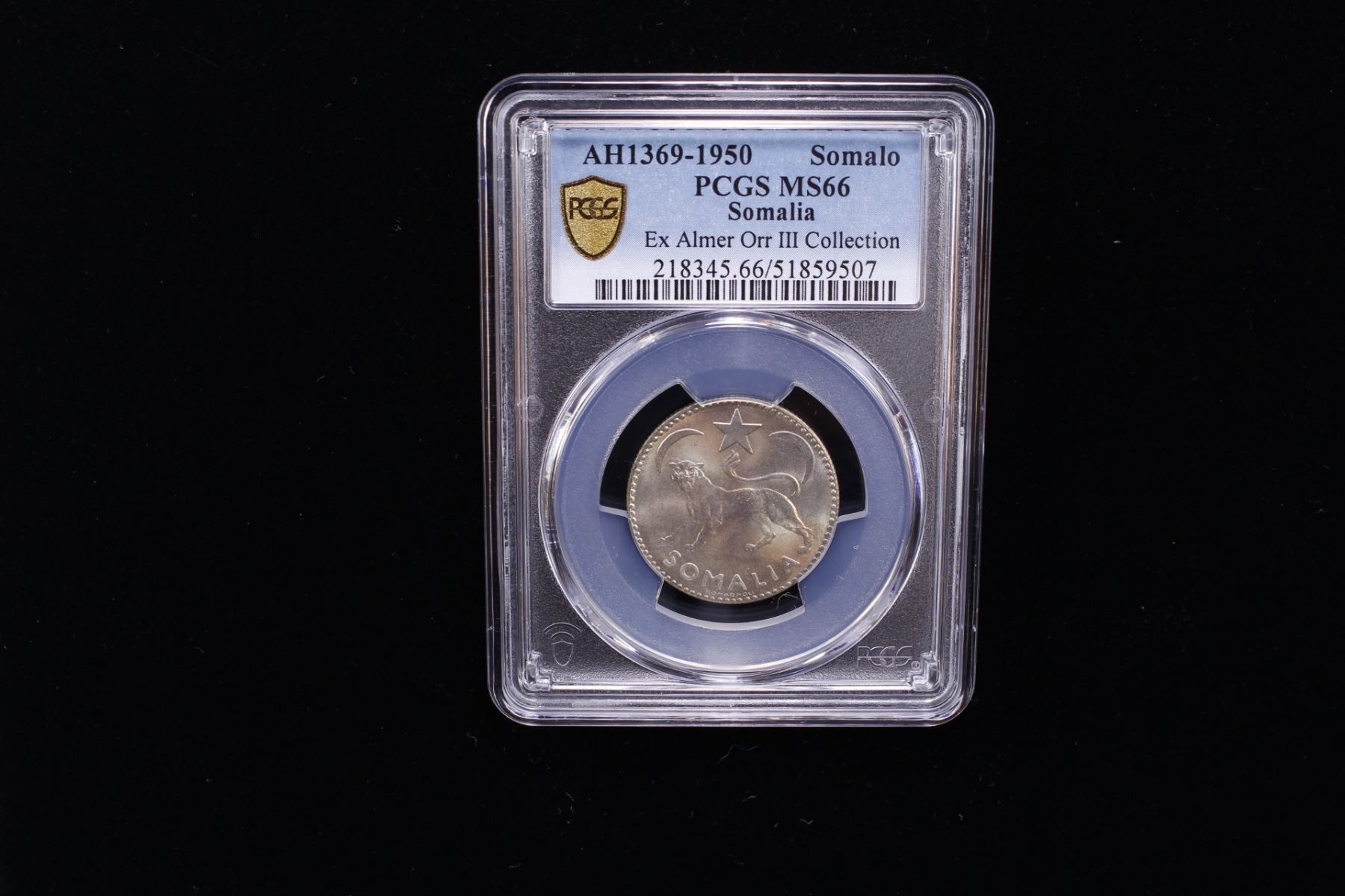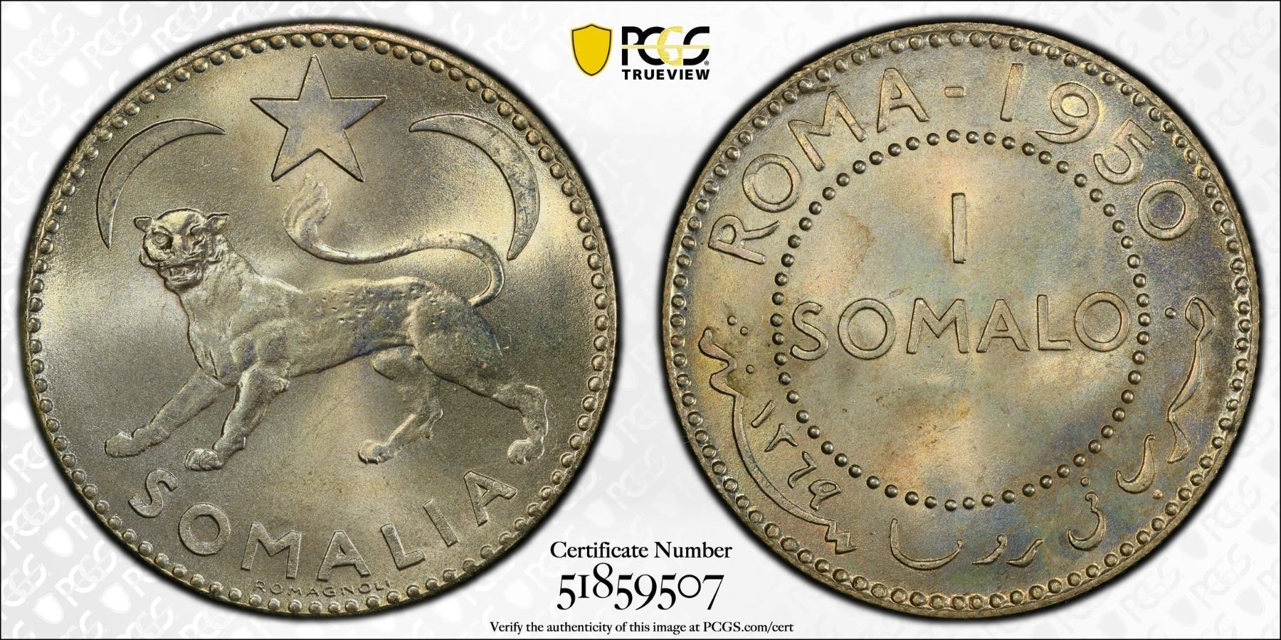 SOMALIA: Trust Territory, AR somalo, 1950/AH1369, KM-5, Leopard, struck at the Rome mint, a fantastic example, PCGS graded MS66, ex Almer H. Orr III Collection.