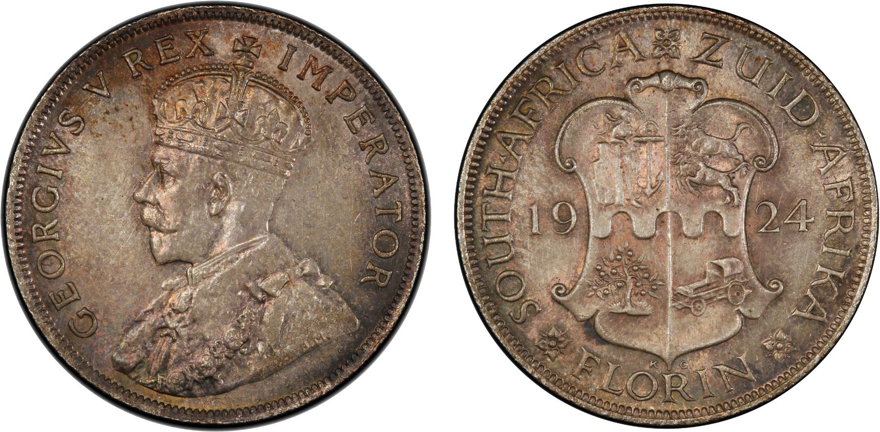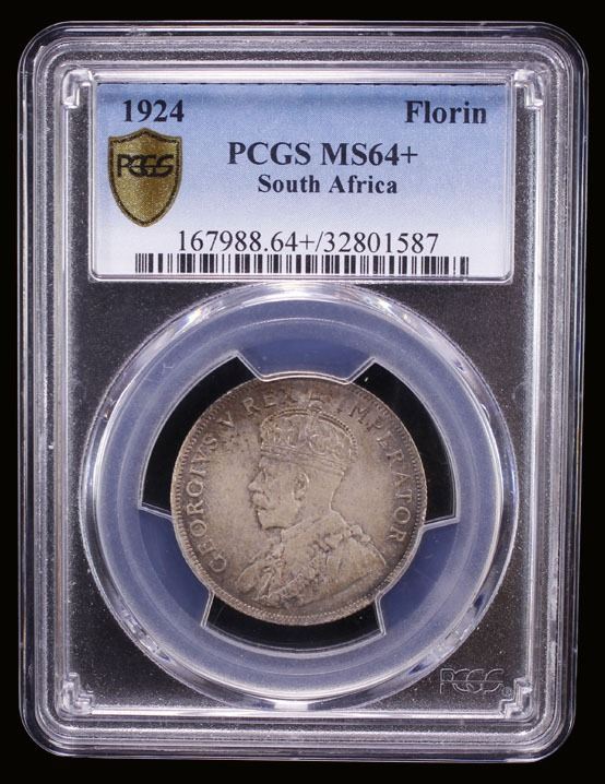 SOUTH AFRICA: George V, 1910-1936, AR florin, 1924, KM-18, lovely soft toning, PCGS graded MS64+, ex Heritage Auction 232105, Lot 61561.