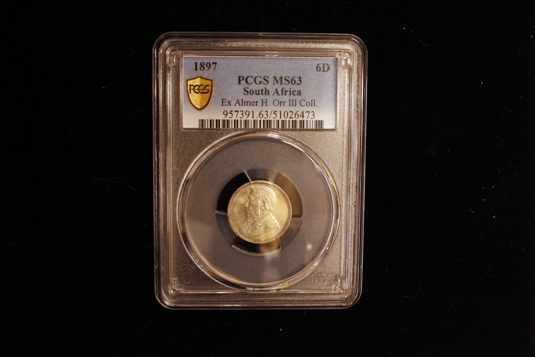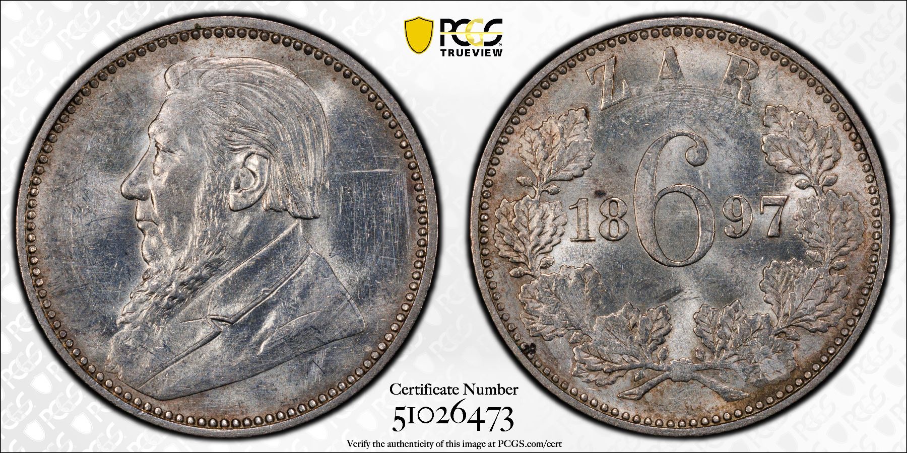 SOUTH AFRICA: Zuid-Afrikaansche Republiek, AR shilling, 1897, KM-5, a lovely mint state example! PCGS graded MS63. Struck at the South African Republic's Mint in Pretoria.