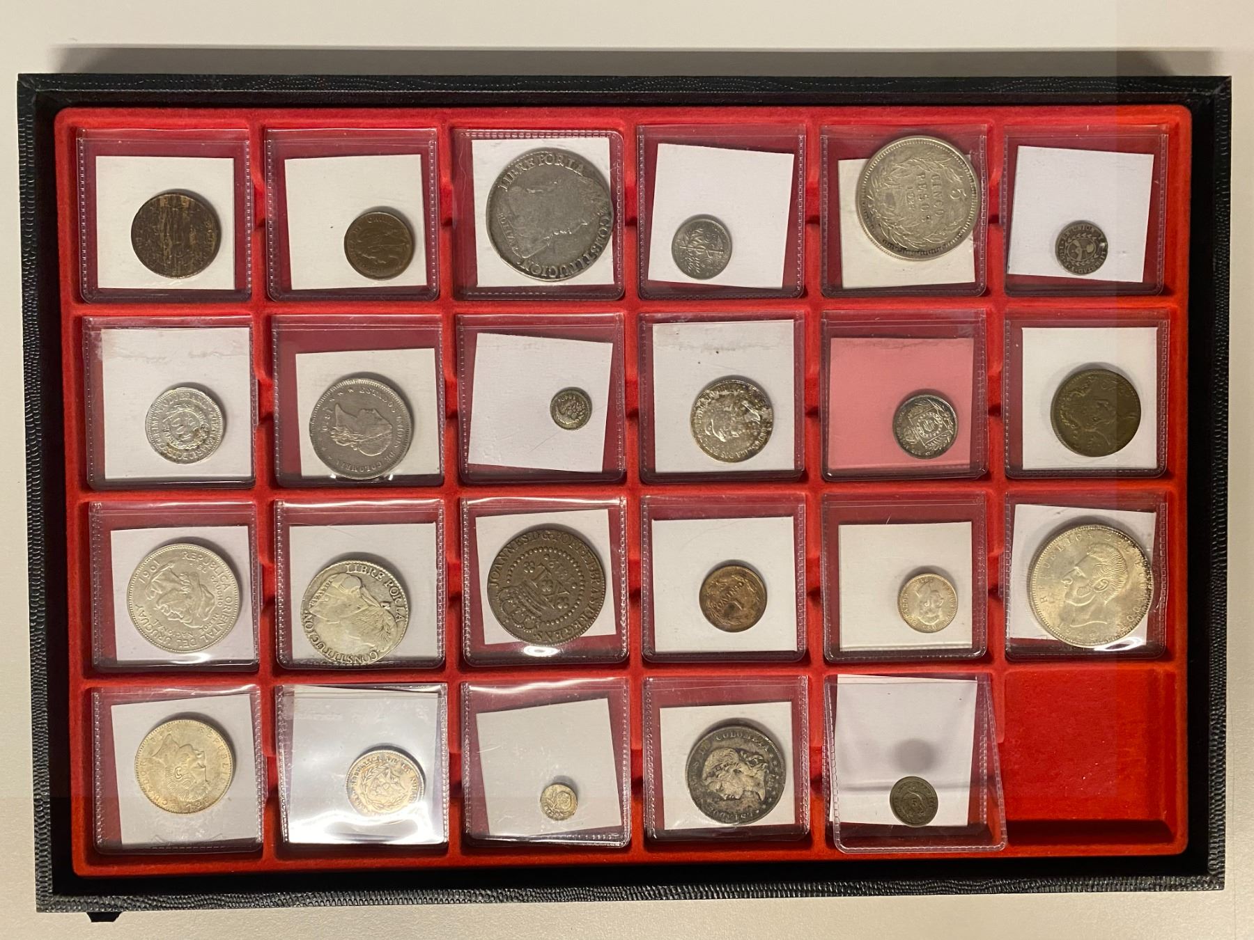 SOUTH AMERICA: LOT of 23 coins, including a Bolivia 1838 8 soles, a Brazil 1900 400 reis and a high grade 1812-R 40 reis, an 1870 Bogota 5 decimos and 1842 1/4 real, and 28 others - a nice collection of a wide variety; retail value $600, lot of 22 pieces.