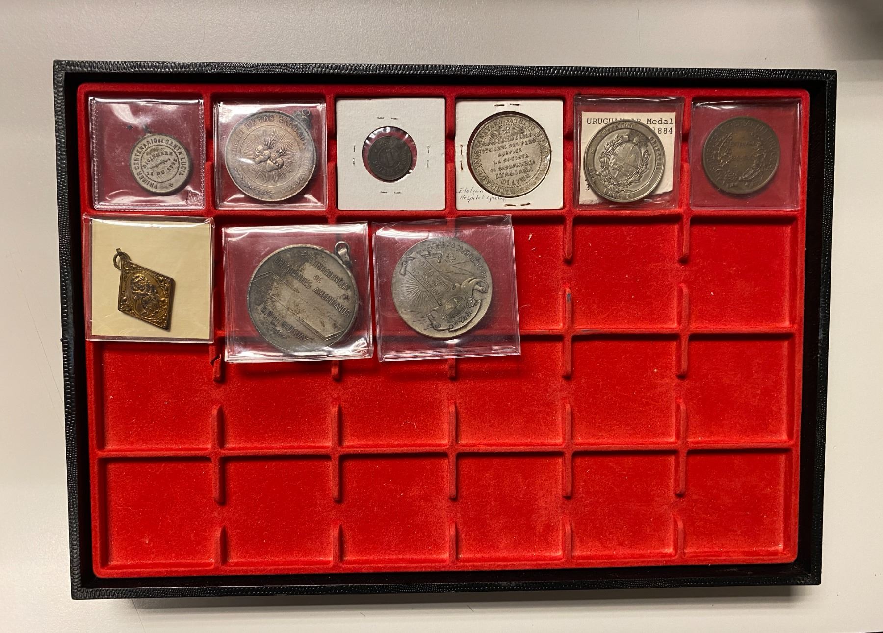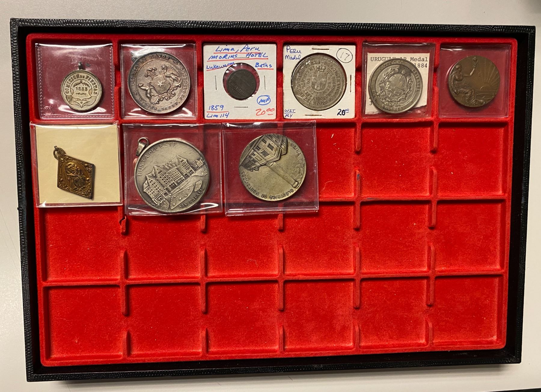 SOUTH AMERICA: LOT of 9 medals and tokens, including Argentina (2, 1883 Comision de Fiestas medal and 1896 Bragado Spanish Association AE klippe medal), Chile (1, College of Sacred Hearts AR medal), Peru (2, 1859 AE Morins Hotel Warm Baths token and ND (1892) silvered AE New Italian Hospital in Lima medal), and Uruguay (4, 1909 silvered AE Montevideo Power Plant medal, 1967 silvered AE Conference of American Presidents medal, 1884 AR Normal School Cornerstone medal, and 1930 AE Centennial of Uruguay medal); average circulated grades, with some better, in consignor's holders, viewing recommended; retail value $275, lot of 9 pieces, AQWE.