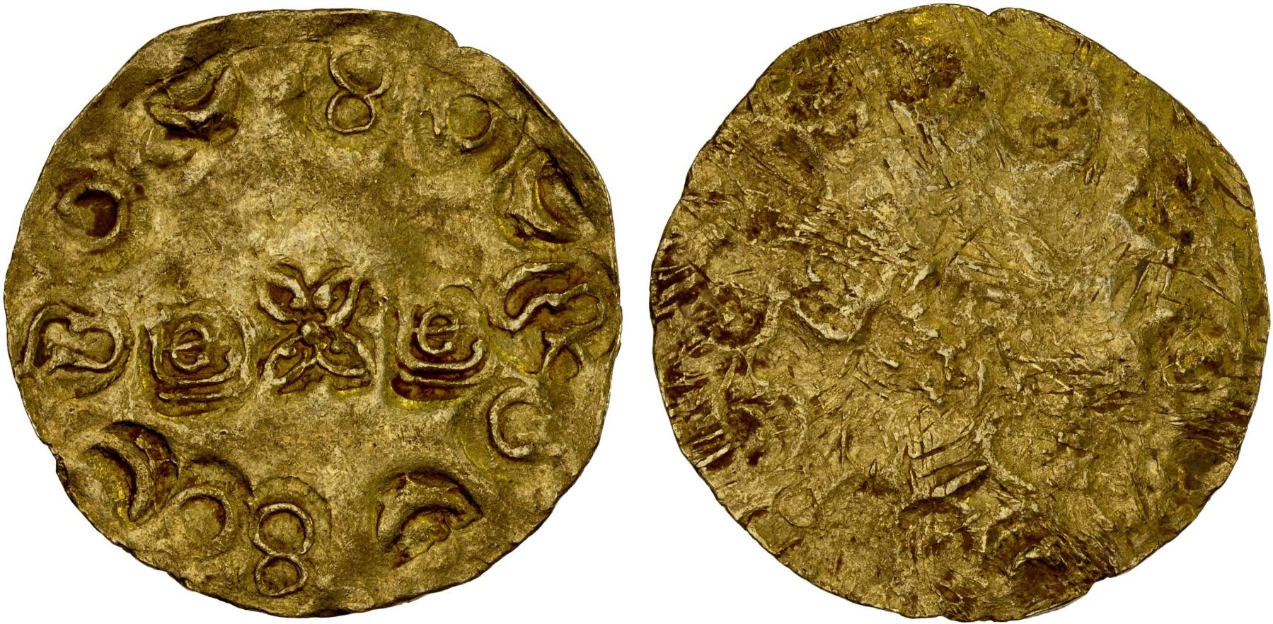 SOUTH INDIA: Unknown issuer, ca. 12th/13th century, punchmarked AV broad gadyana, various punchmarks: 4-petal lower in center, two sri symbols towards the center, 12 outer punches, including one with a snake; unidentified, VF-XF, ex Syed Rabbi Collection.