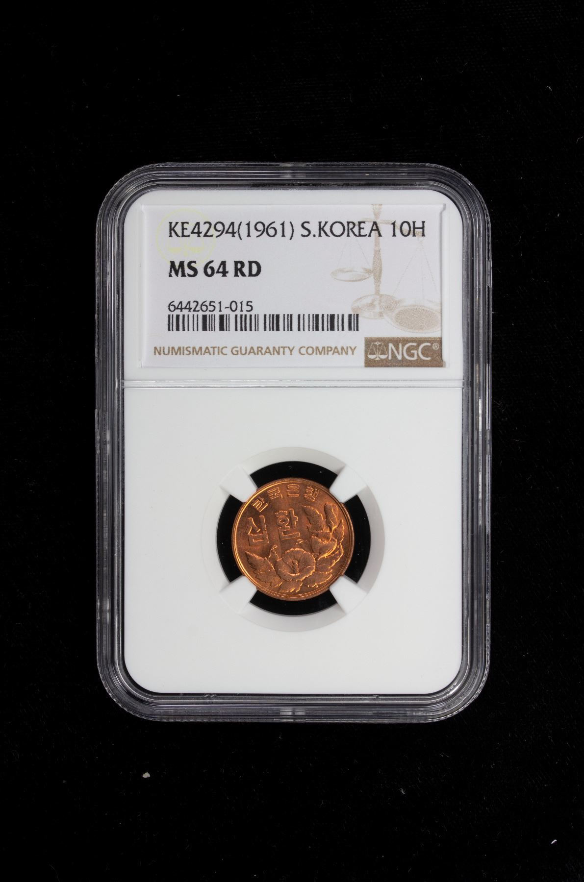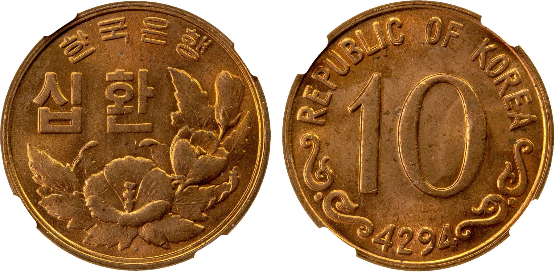 SOUTH KOREA: AE 10 hwan, KE4294 (1961), KM-1, regular issue, without the "sampler" countermark, struck at the Philadelphia mint, NGC graded MS64 RD.